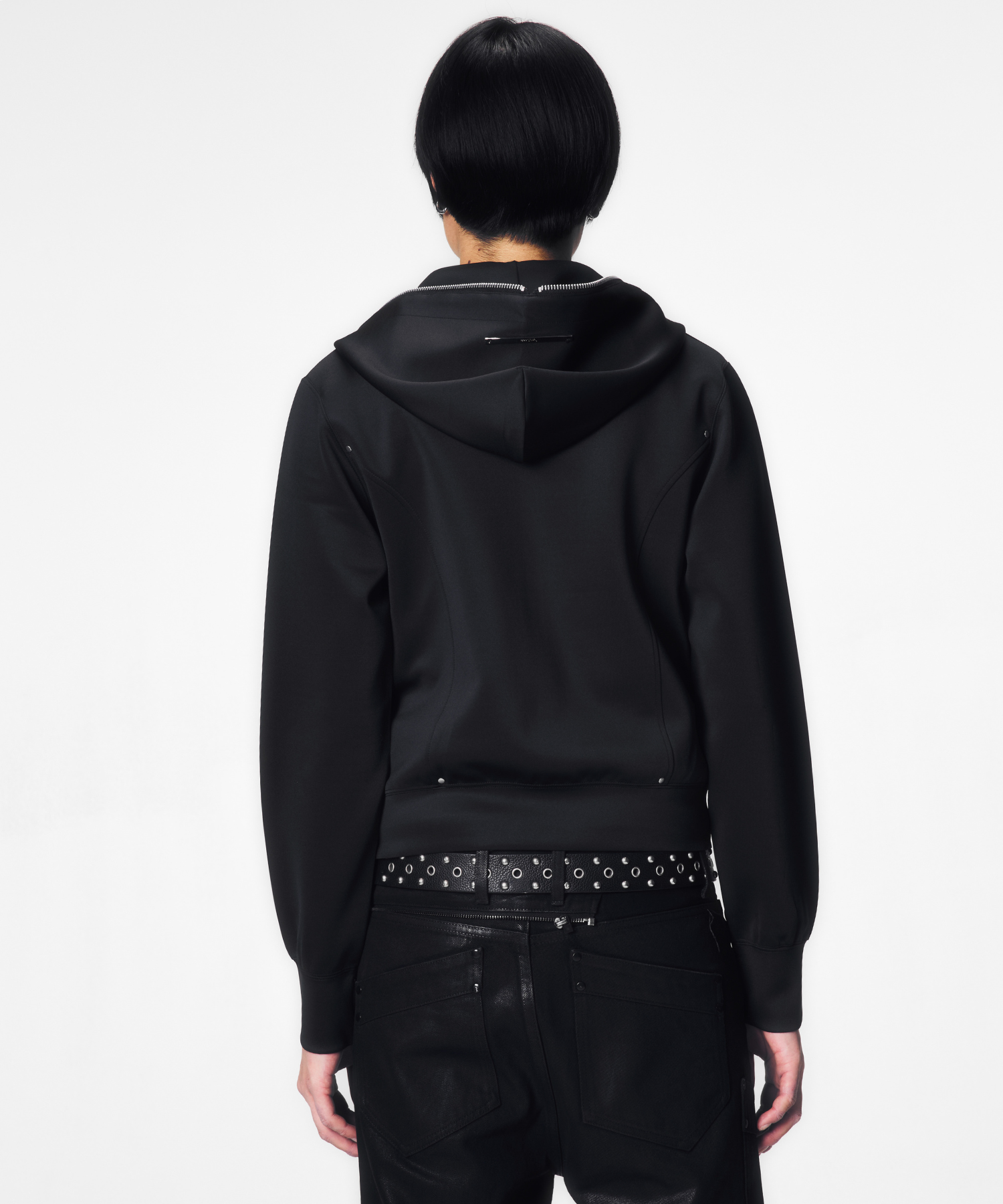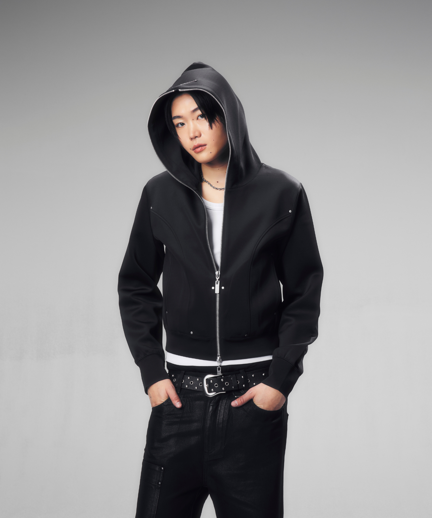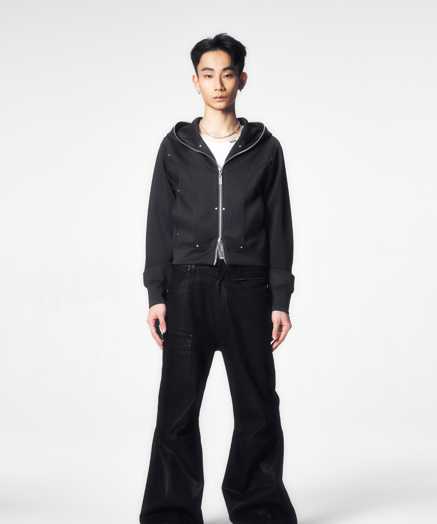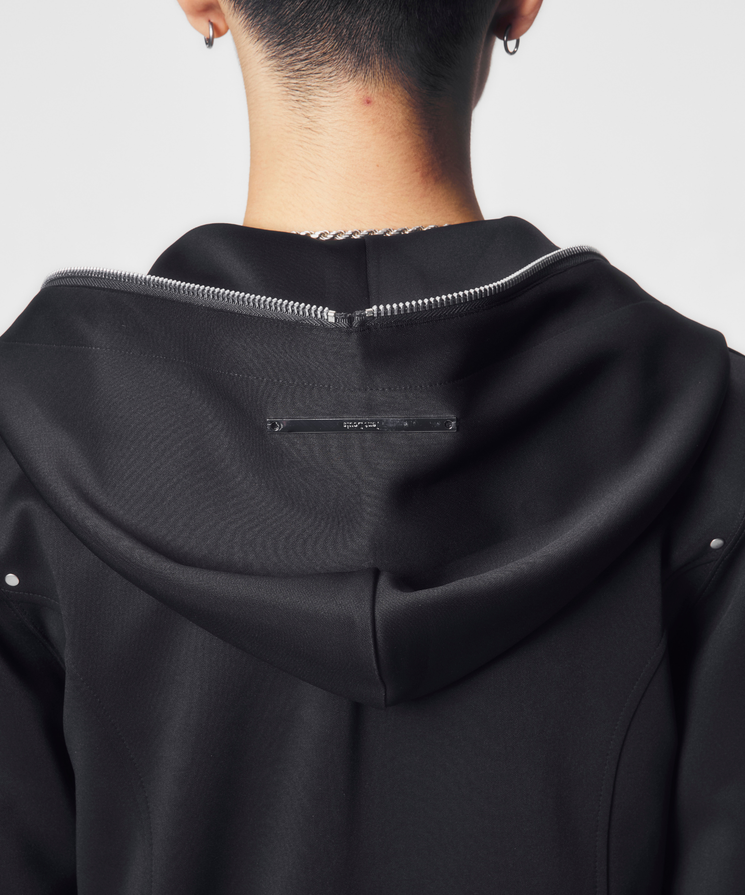 短丈かつ細身の設計により、視線が自然と上に集まり、全体のバランスをシャープに引き上げます。フード先端まで走るフルジップは、閉じればモードな緊張感を、開けばレイヤードの余白を生み出します。ミニマルでありながら、シルエットと構造で語る設計は、ワイドパンツからスリムボトムまで幅広く呼応します。