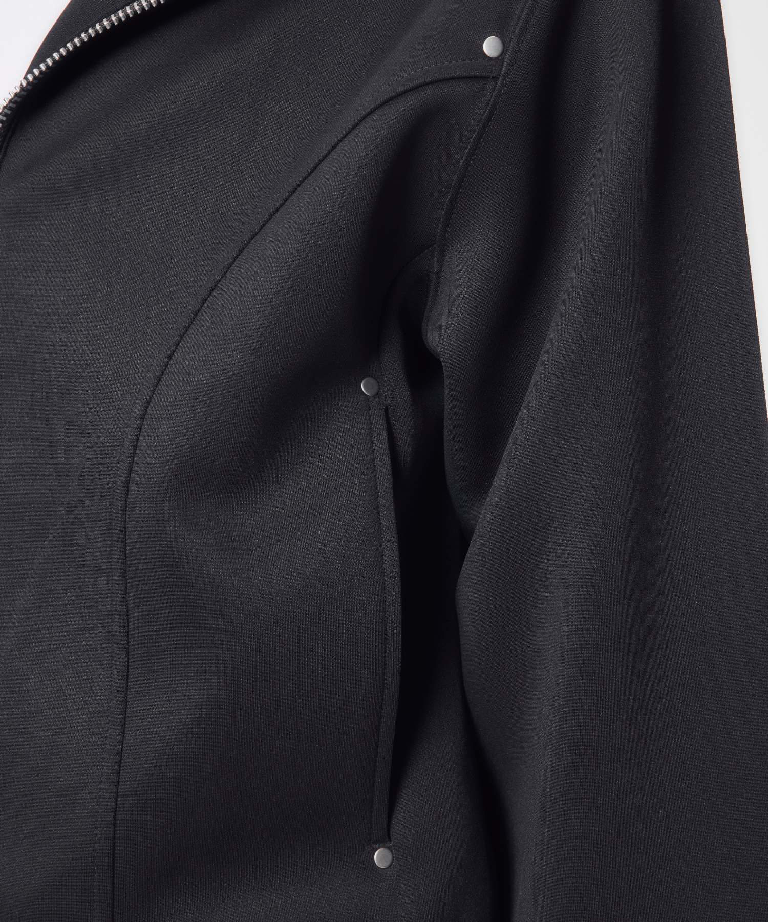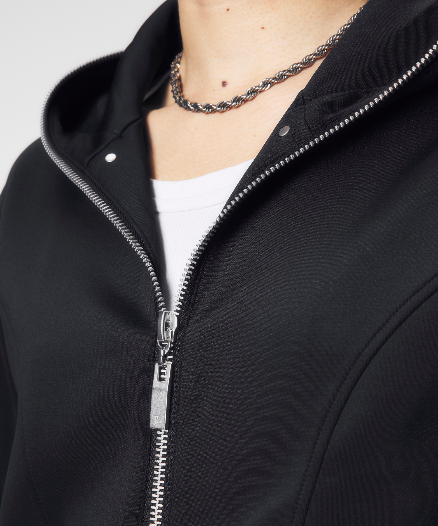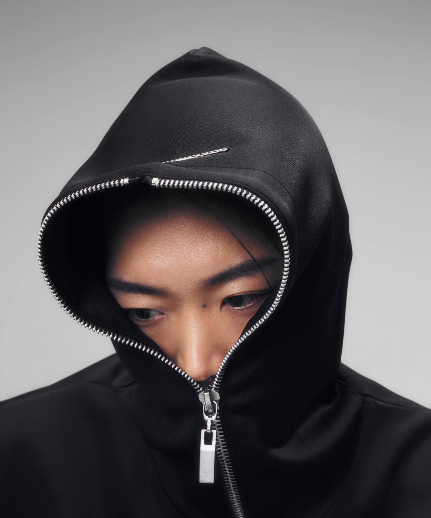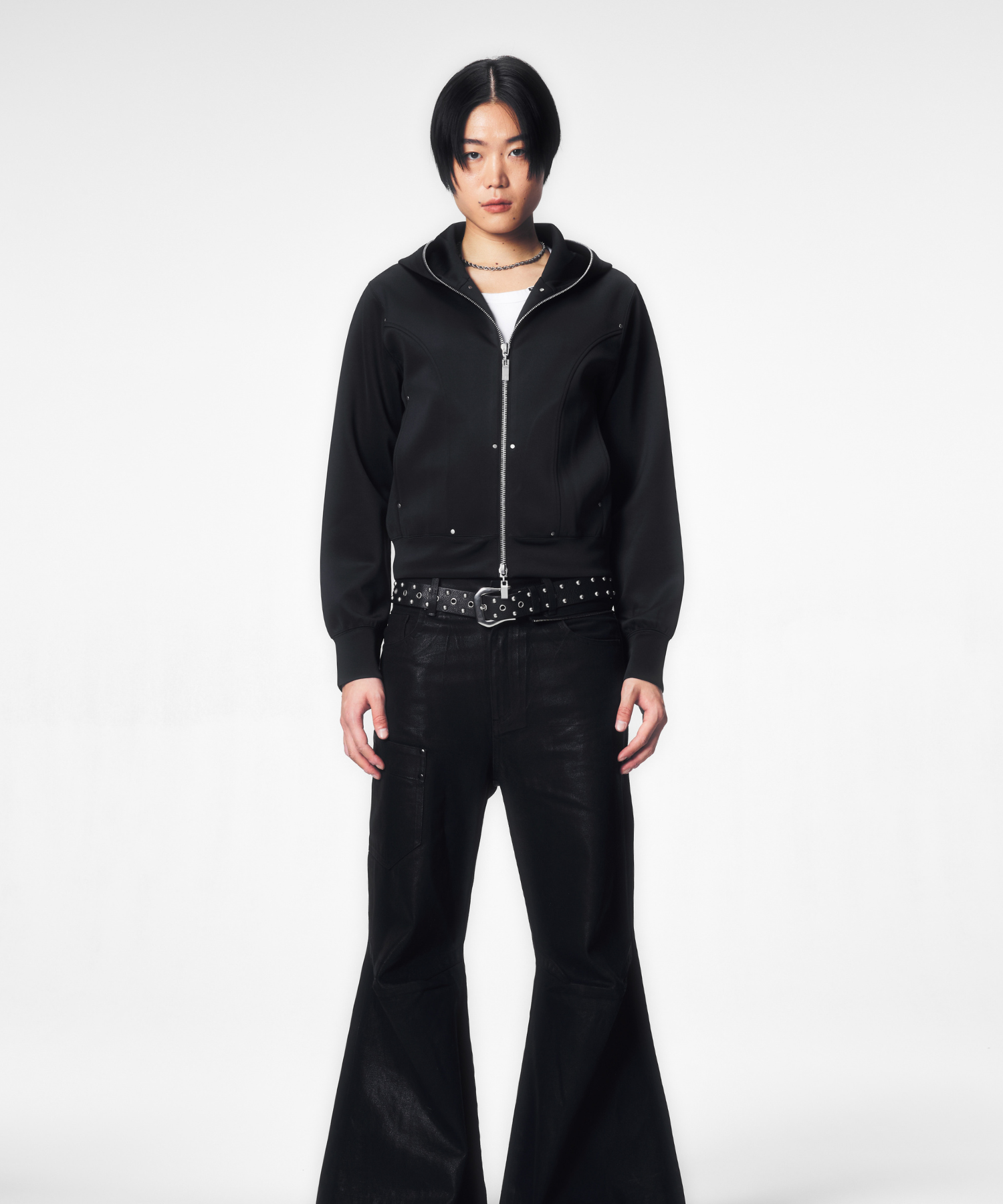 短丈かつ細身の設計により、視線が自然と上に集まり、全体のバランスをシャープに引き上げます。フード先端まで走るフルジップは、閉じればモードな緊張感を、開けばレイヤードの余白を生み出します。ミニマルでありながら、シルエットと構造で語る設計は、ワイドパンツからスリムボトムまで幅広く呼応します。