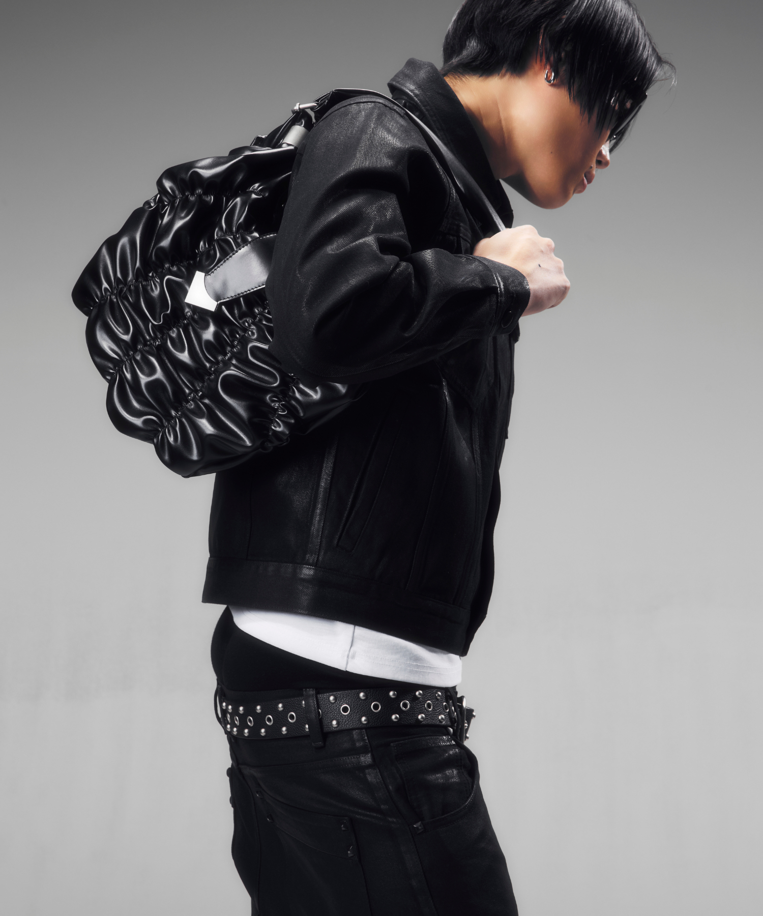 -ファブリック-本体には合成レザーを使用。表面は滑らかな質感を持ちながら、適度なハリと柔軟性を兼ね備えています。シワやドレープを美しく出せる素材特性により、バッグ全体に立体的な陰影が生まれます。合成レザーは軽さと耐久性を両立しており、日常使いの中でも形状を保ちやすいのが特徴です。使用を重ねることで素材が徐々に柔らかくなり、ギャザー部分のドレープがより自然に馴染んでいきます。無骨さと扱いやすさを兼ね備えた、日常に溶け込む機能的なファブリックです。