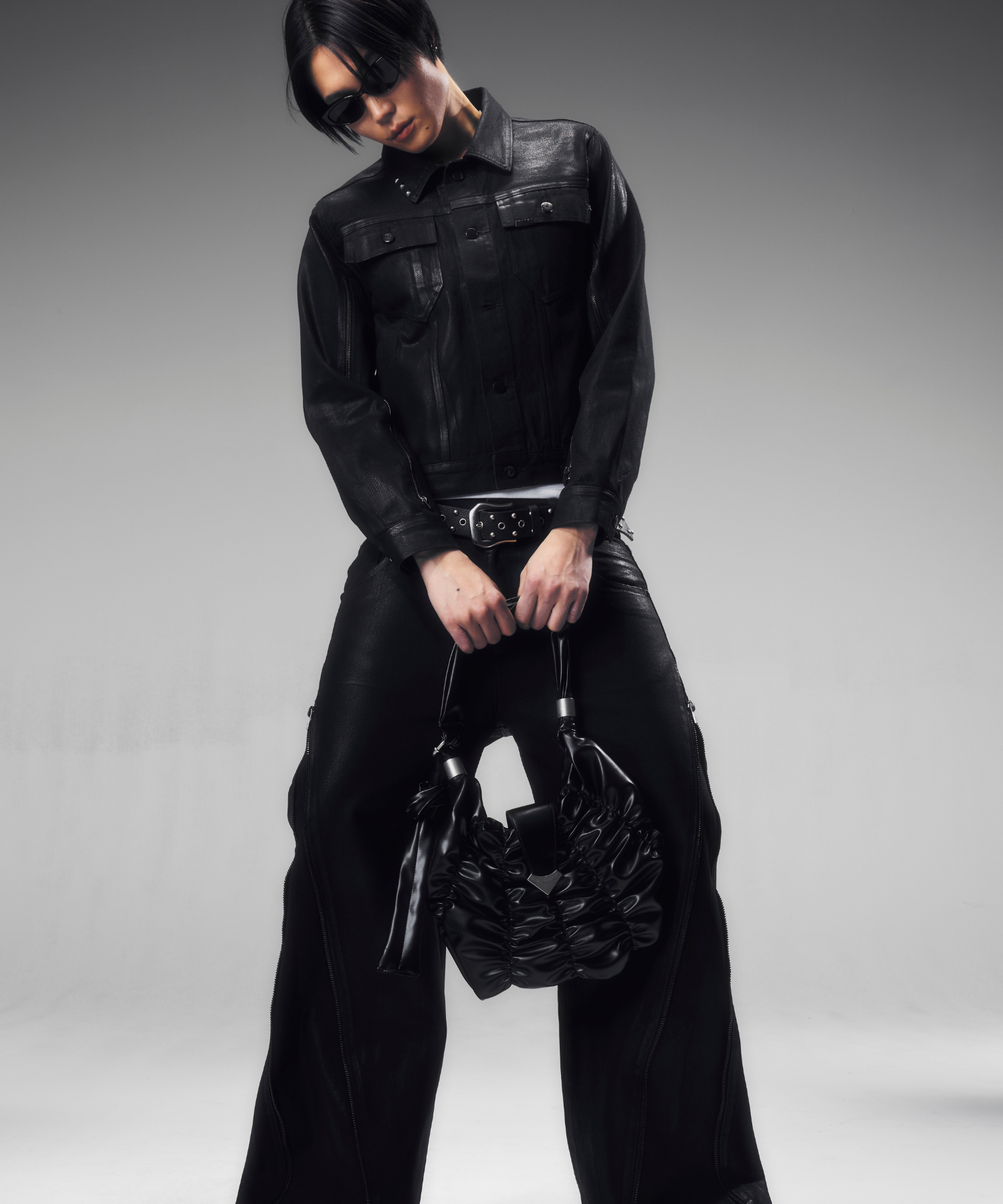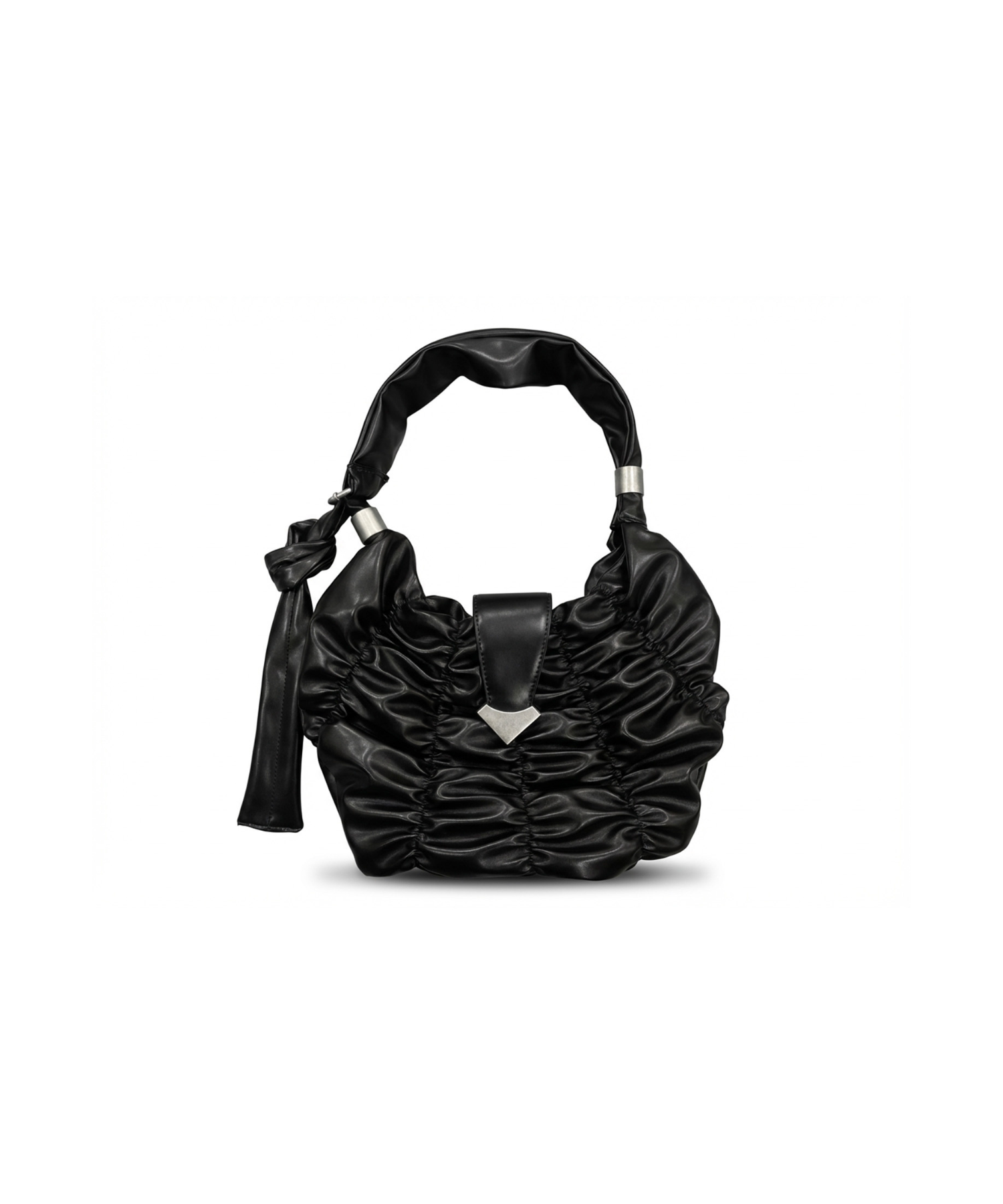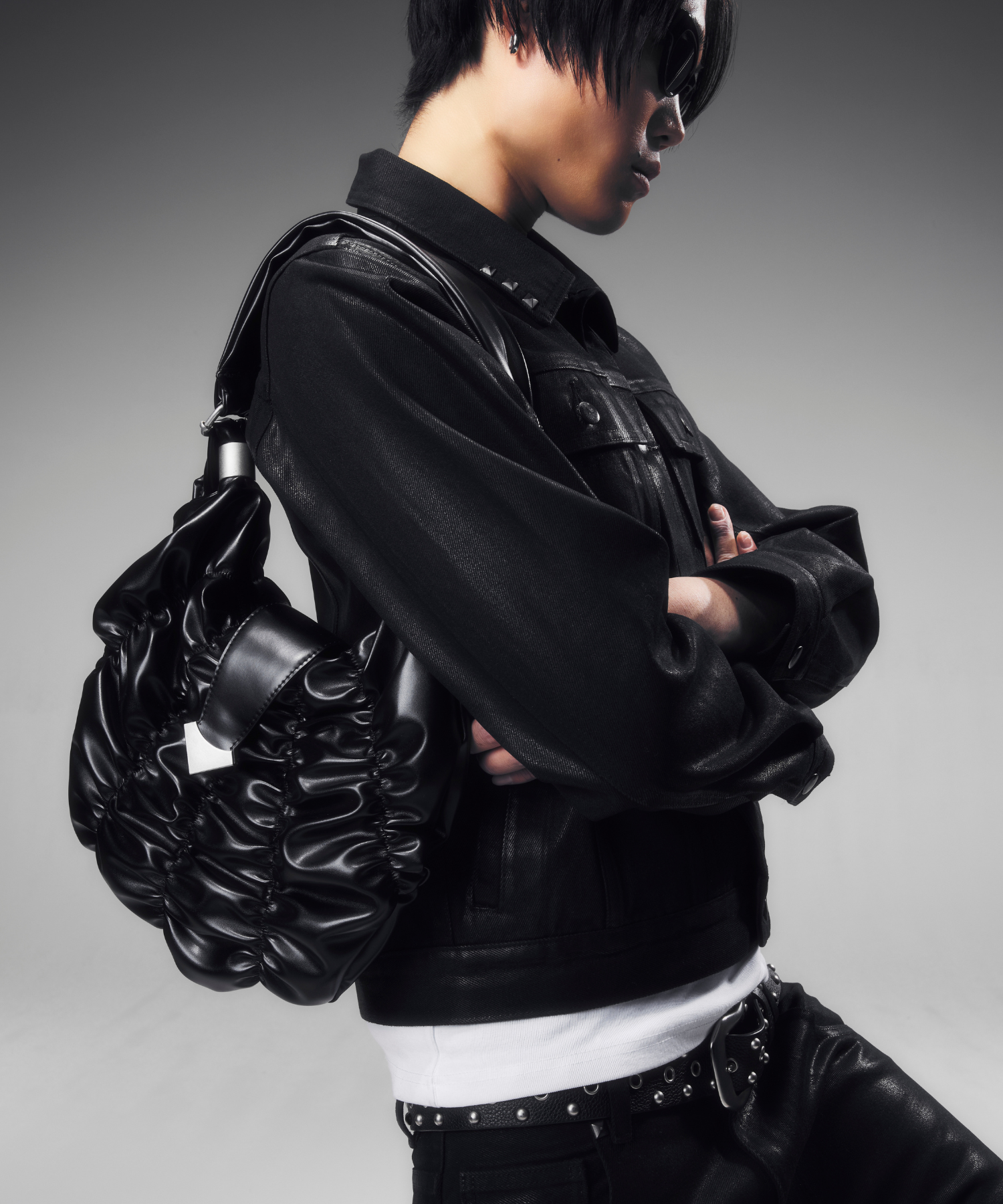 -デザイン-バッグの開口部にギャザーを寄せることで、布の彫刻のような立体感を生み出したデザインです。シンプルな構造ながら、絞られたフォルムが自然なドレープをつくり、持ったときに柔らかな陰影が生まれます。装飾を増やすのではなく、素材の寄せ方と形状だけで存在感をつくる設計。ブラックのボディはスタイリングを選ばず、レザーやデニム、シルバーアクセサリーとも自然に調和します