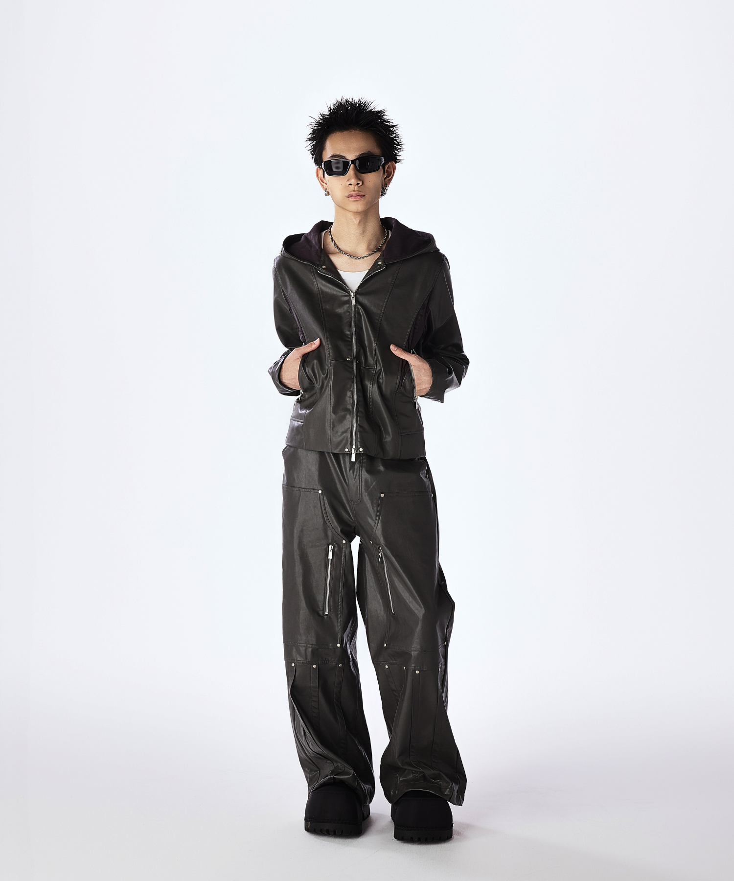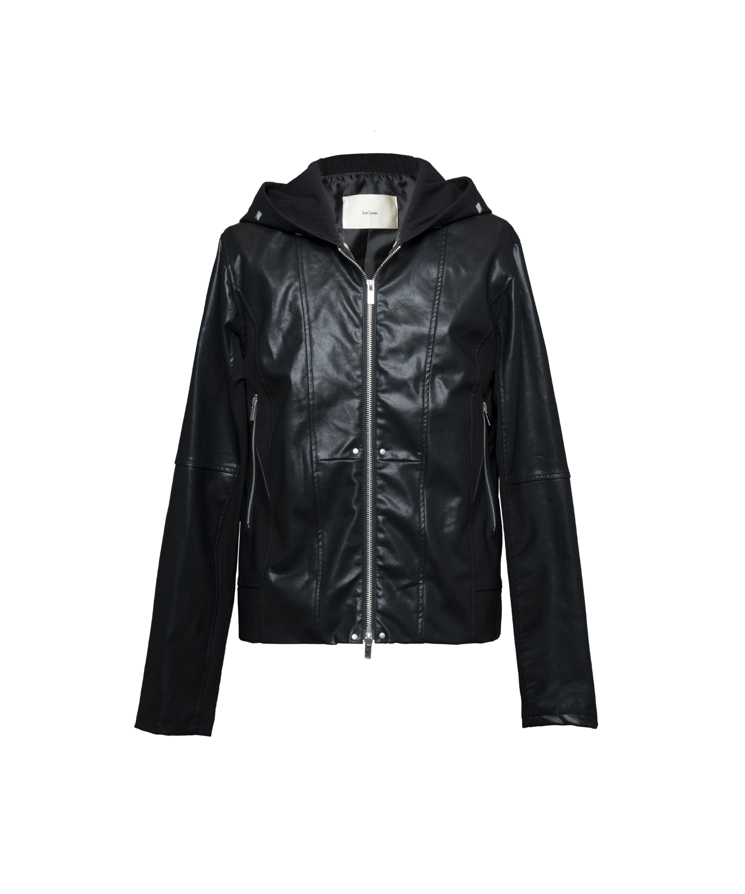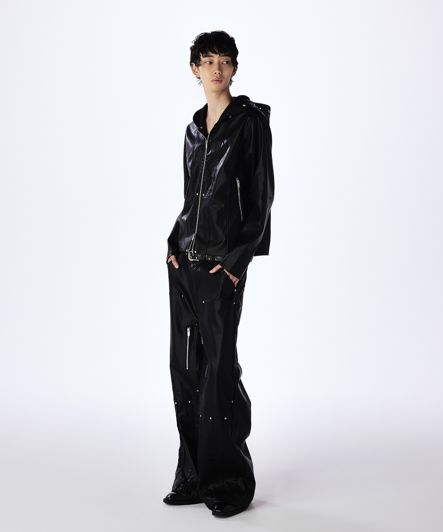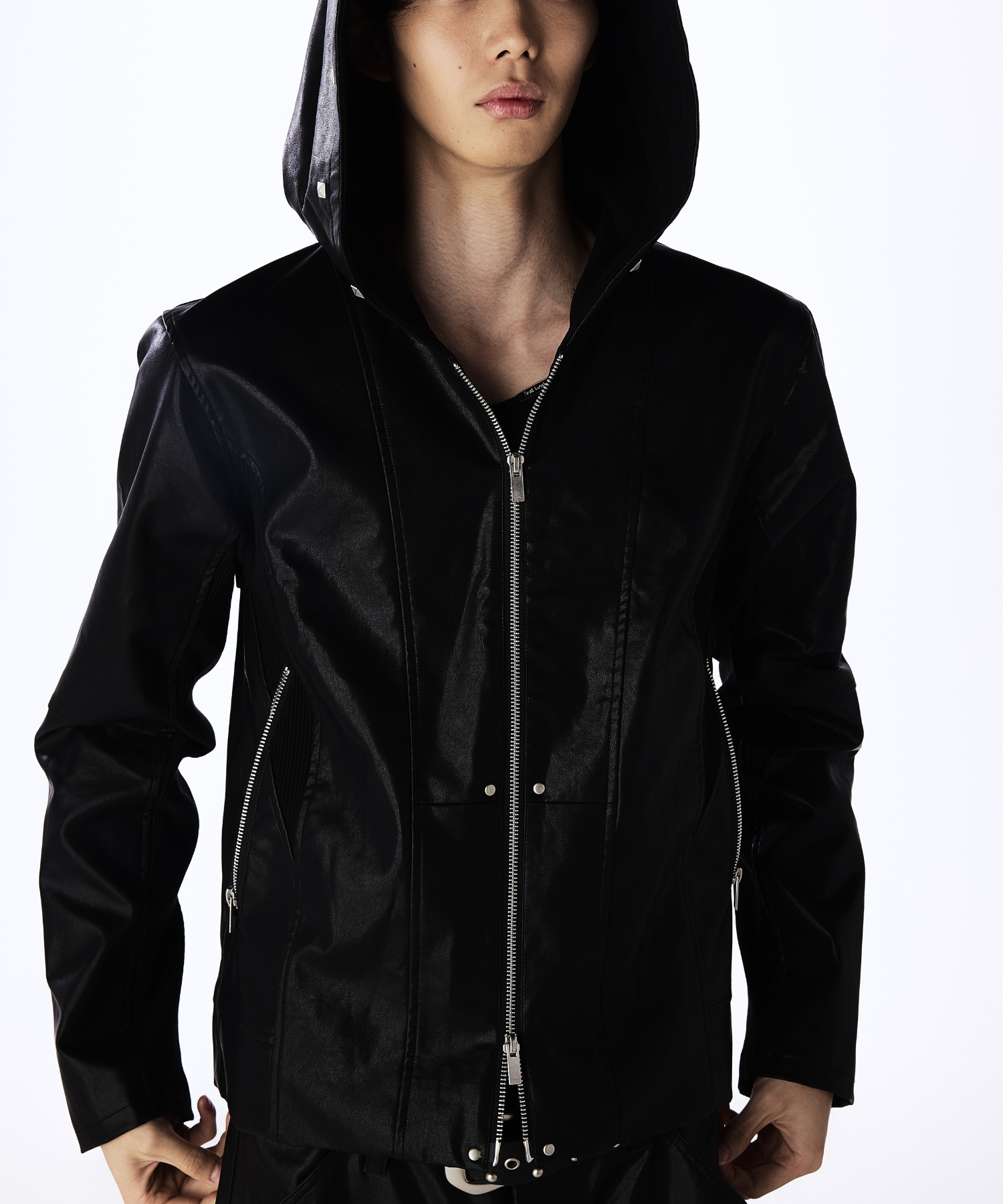 フロントはダブルジップ仕様で、シルエットの変化とレイヤードを楽しめるデザイン。 大きめのフードには縁をぐるりと囲むようにスタッズを配置し、ハードな印象と高級感をプラス。 幅はタイトに設定されているため、AラインやIラインのシャープなシルエットを美しく描きます。 スタイリング次第でモードにもストリートにも振れる一着です。