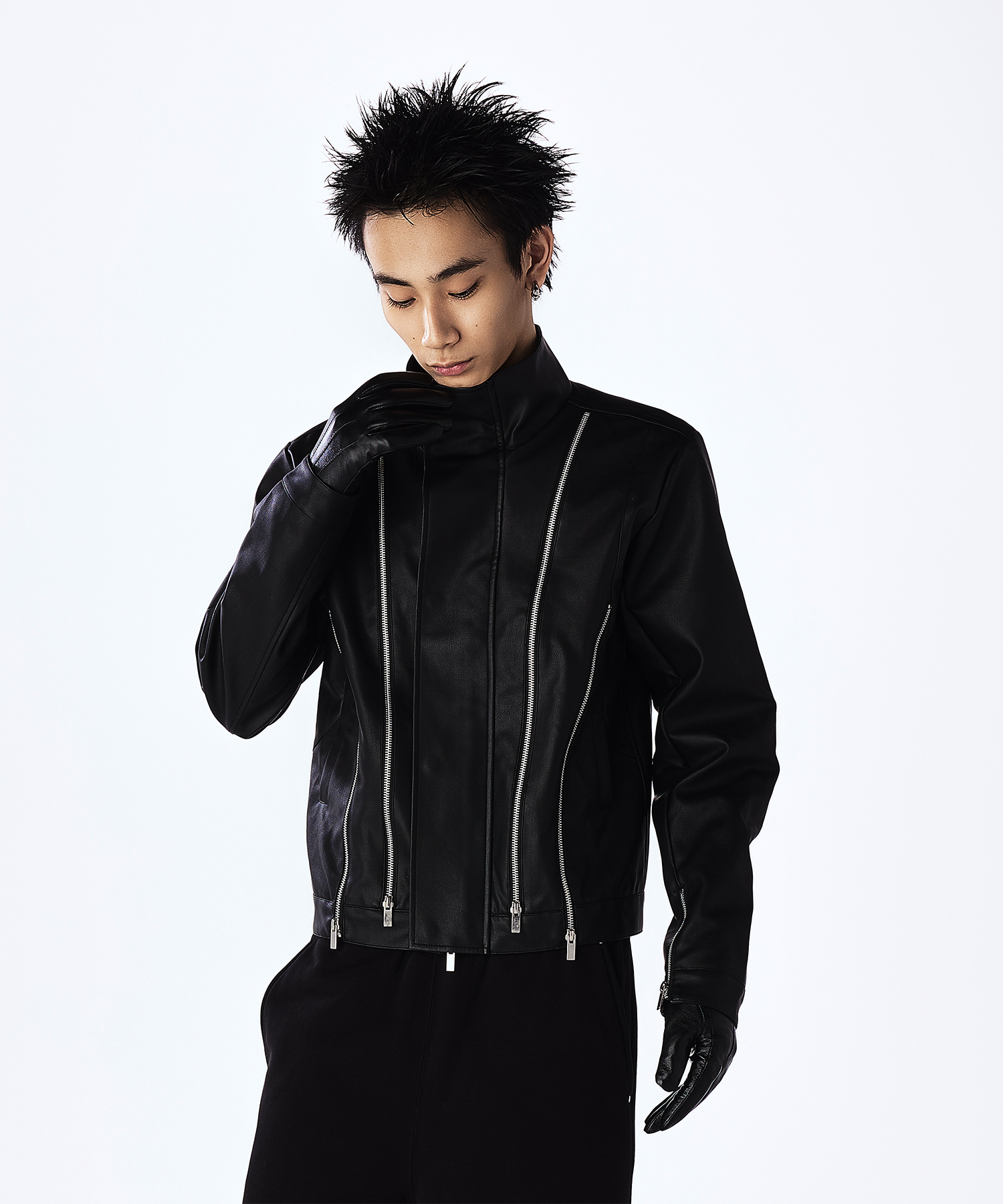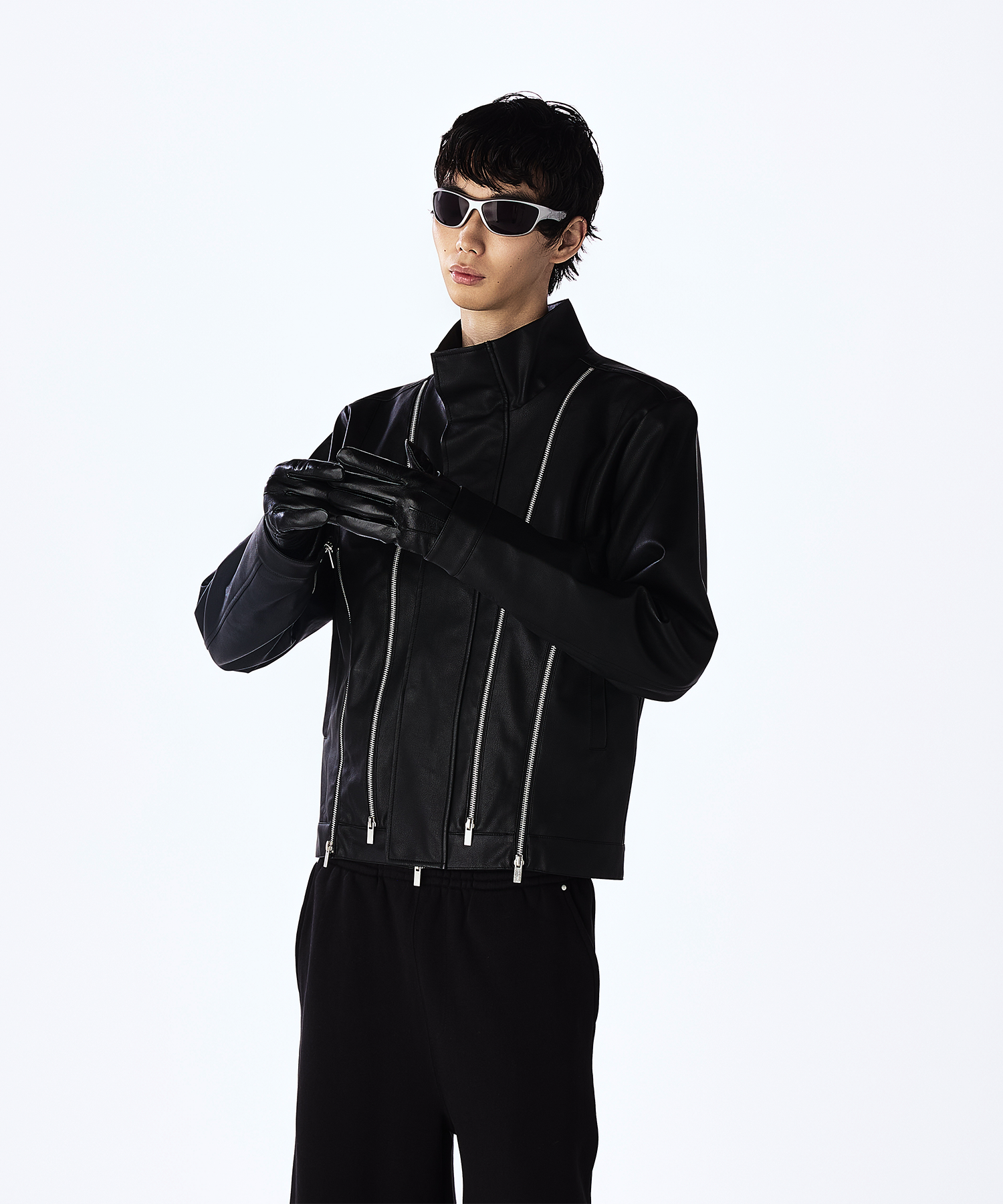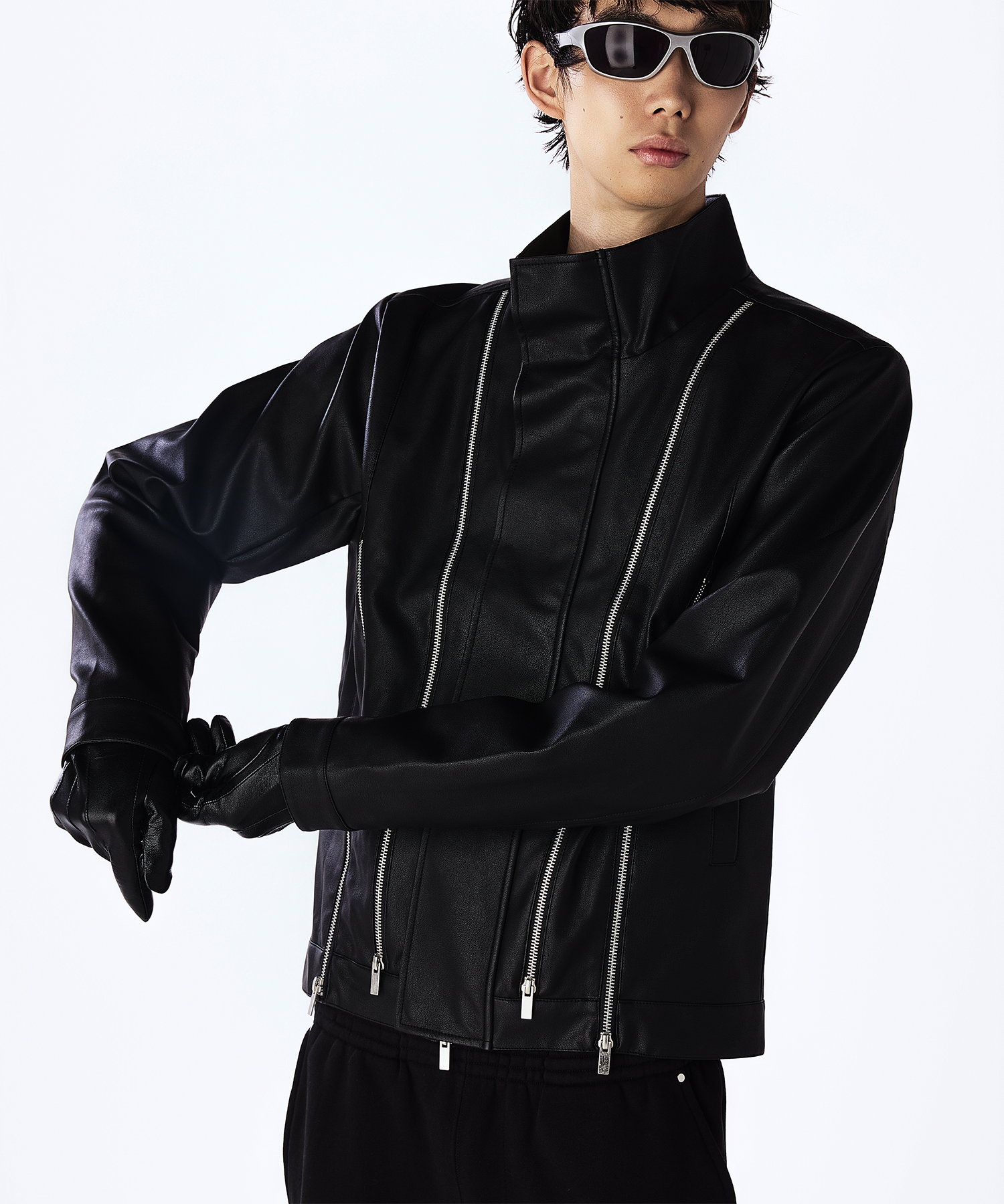 モードな印象を際立たせるスタンドネックに、合計7本のジップがアイコニックな一着。メインのダブルジップに加え、4本の縦ジップがフロントデザインのアクセントとなり、さらに袖にもファスナーを配したことで、直線的でシャープな印象を強調しています。タイトなシルエットとスタンドネックの組み合わせが、洗練されたモード感を際立たせ、着こなしに確かな存在感を与えます。