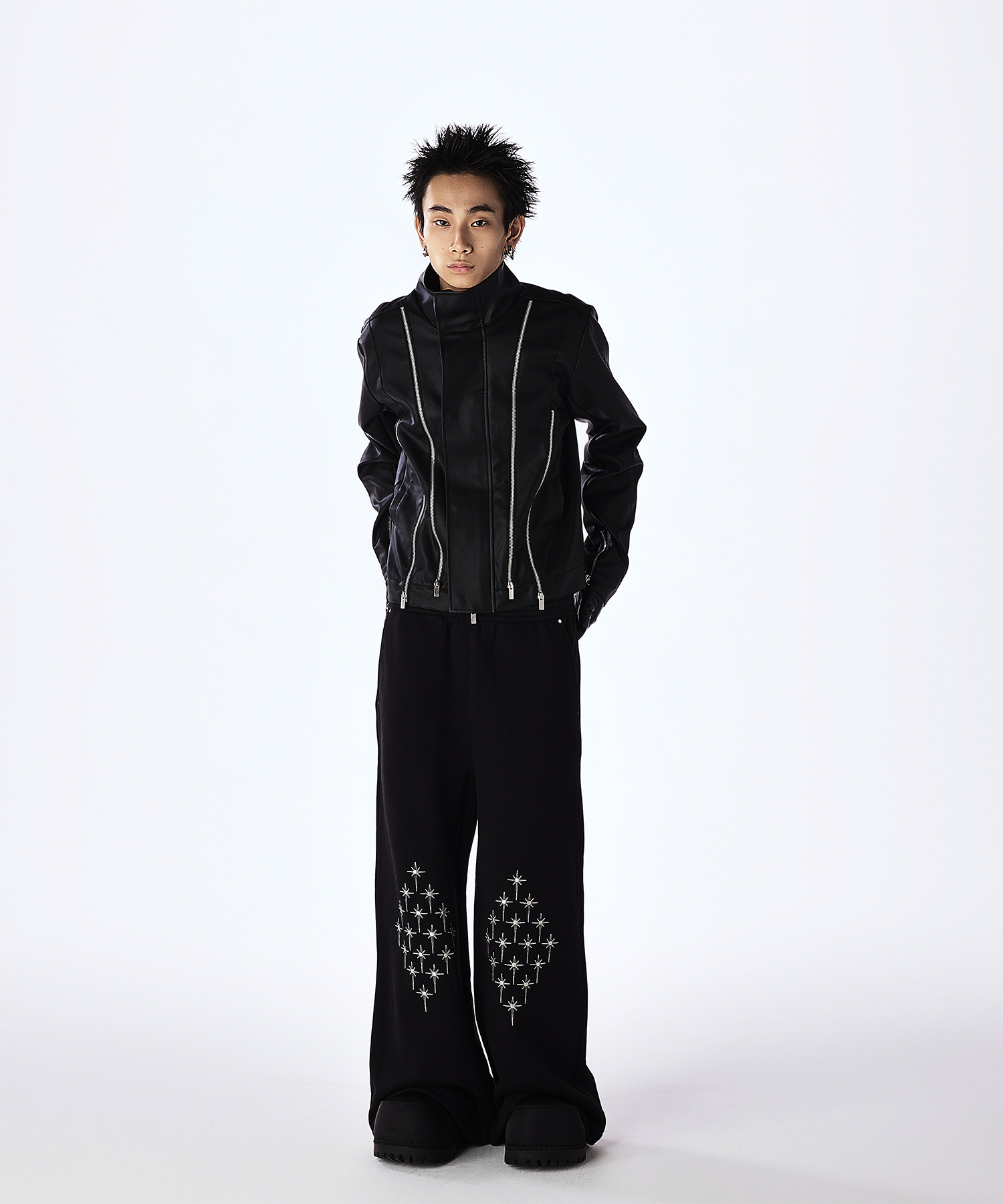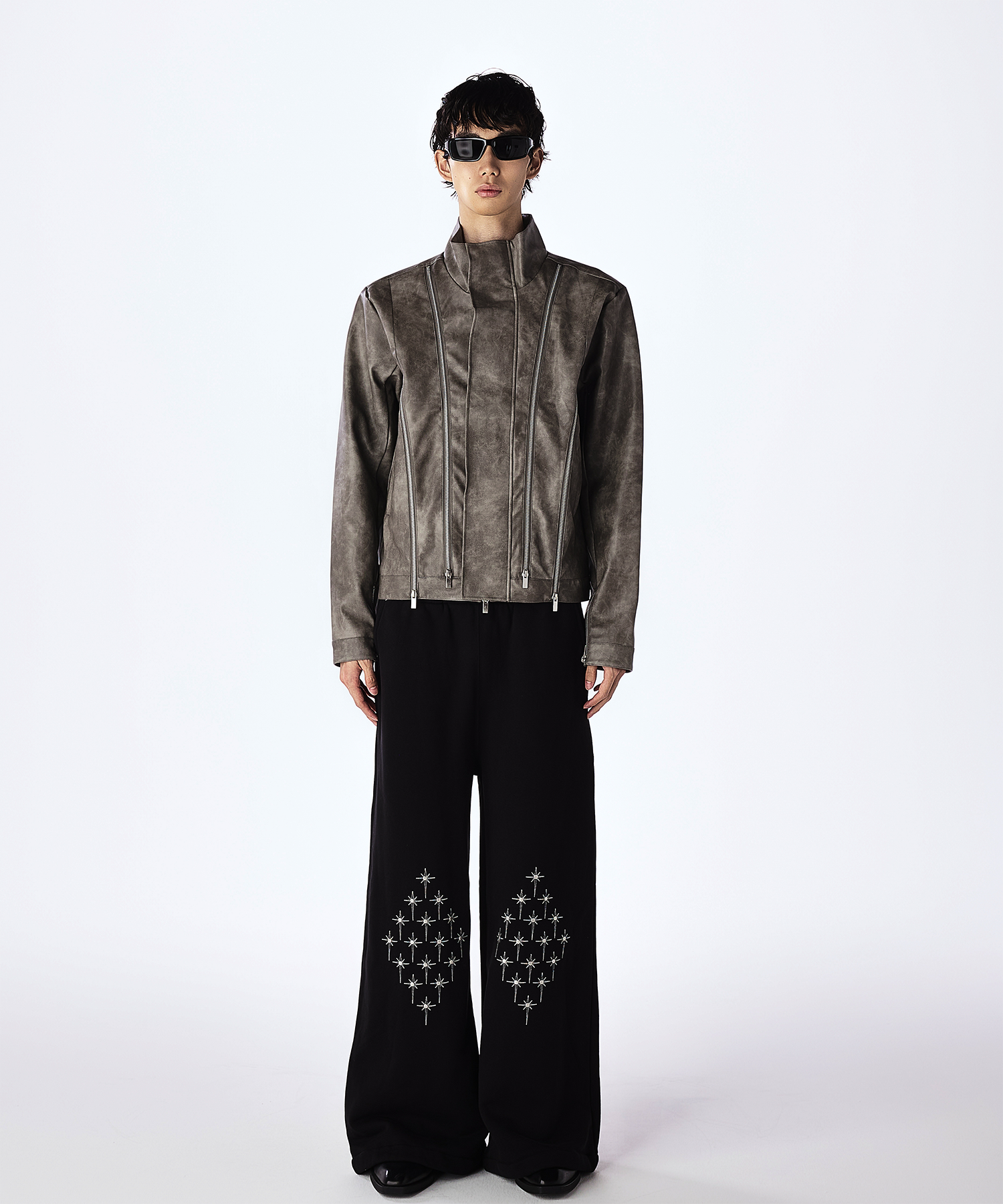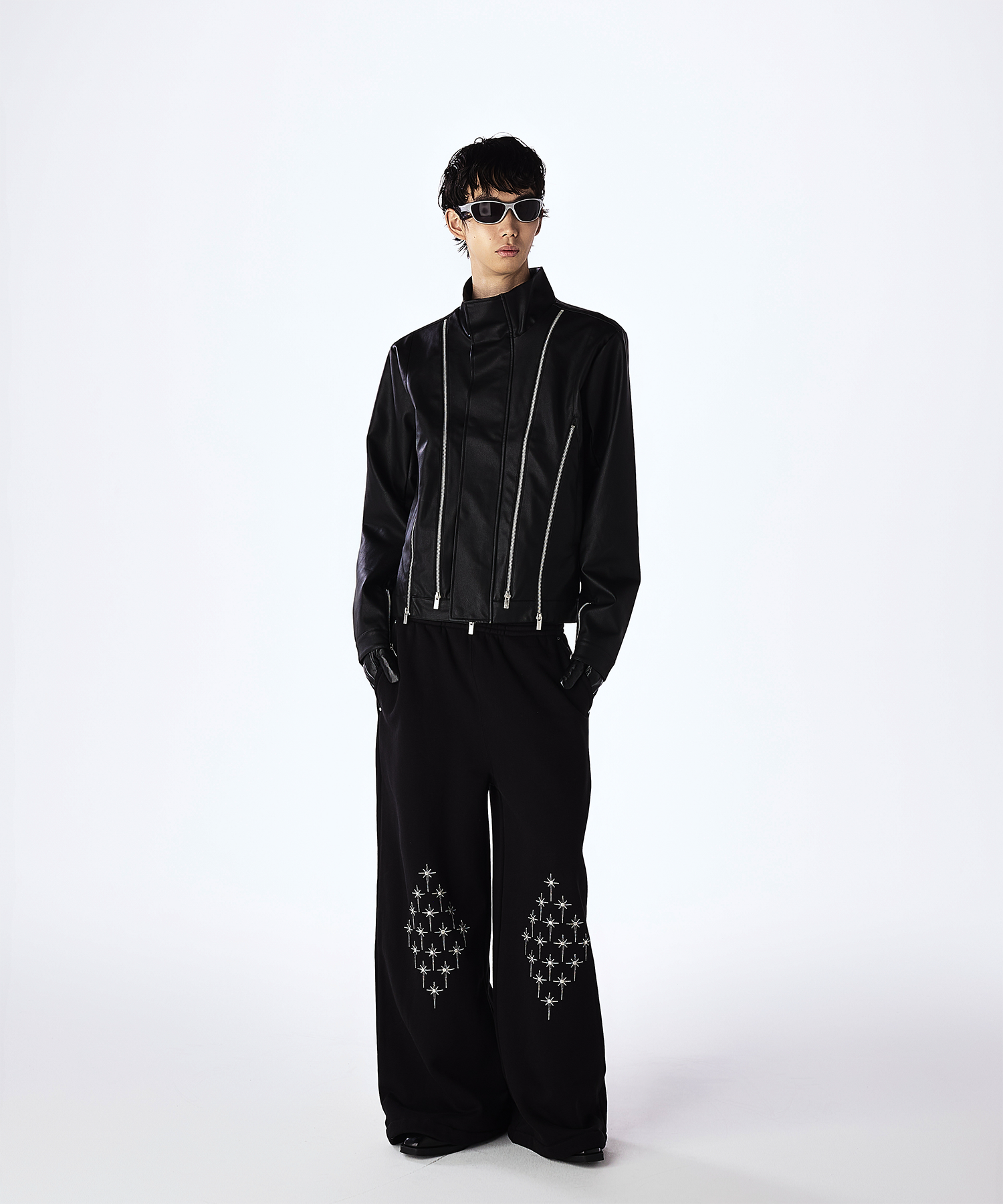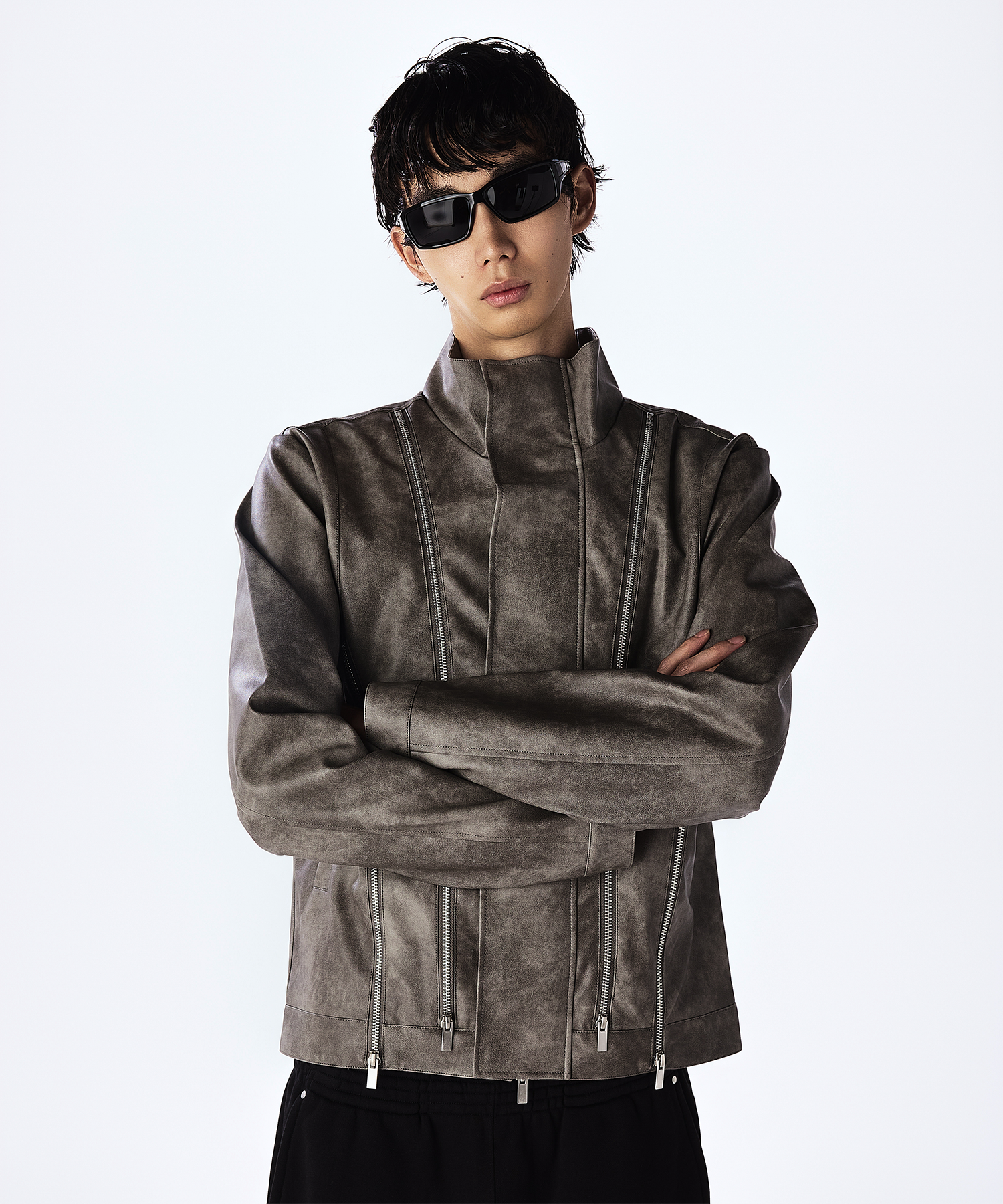 モードな印象を際立たせるスタンドネックに、合計7本のジップがアイコニックな一着。メインのダブルジップに加え、4本の縦ジップがフロントデザインのアクセントとなり、さらに袖にもファスナーを配したことで、直線的でシャープな印象を強調しています。タイトなシルエットとスタンドネックの組み合わせが、洗練されたモード感を際立たせ、着こなしに確かな存在感を与えます。