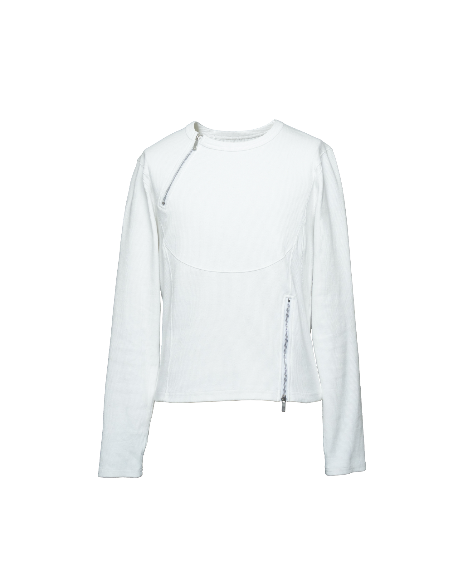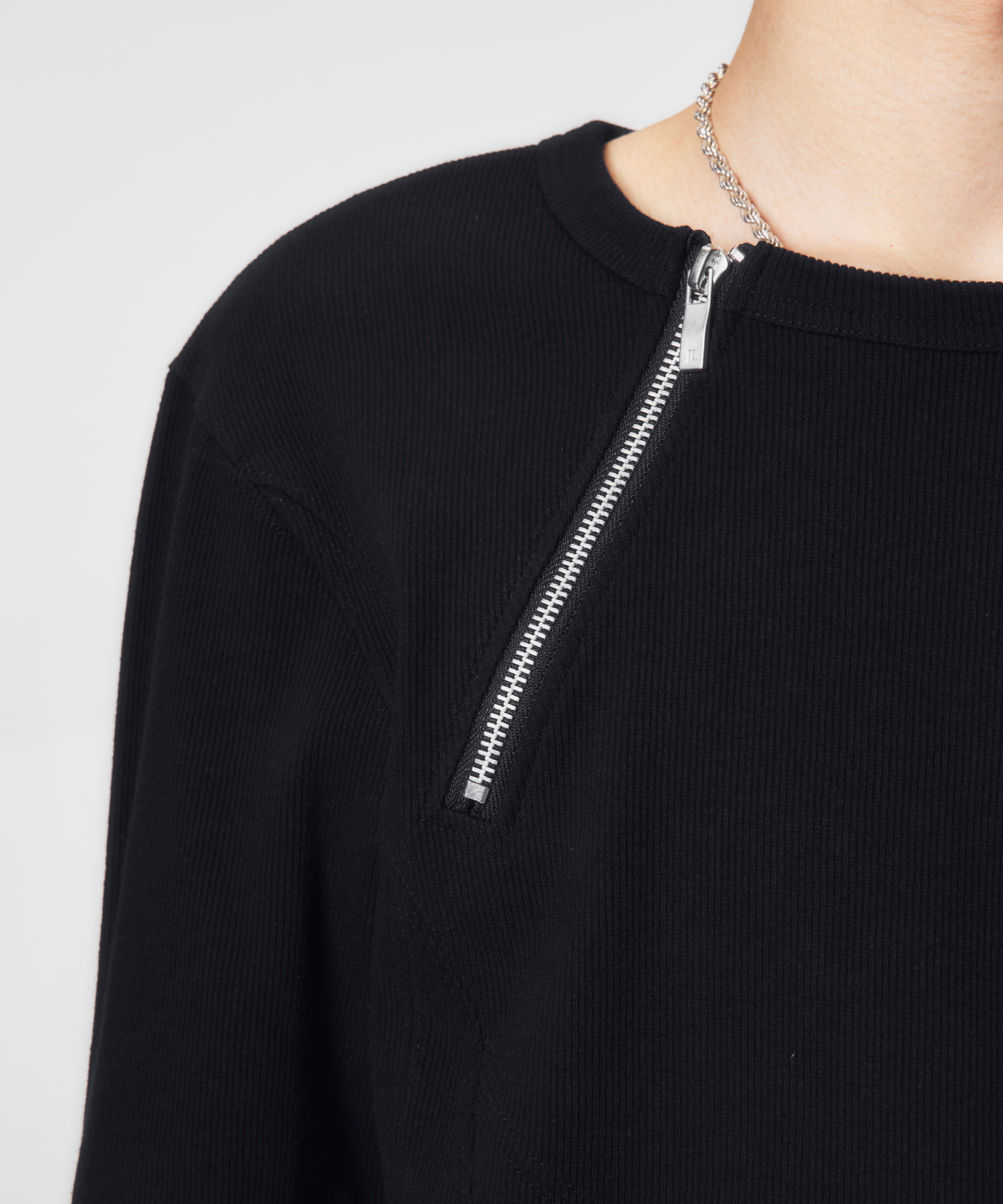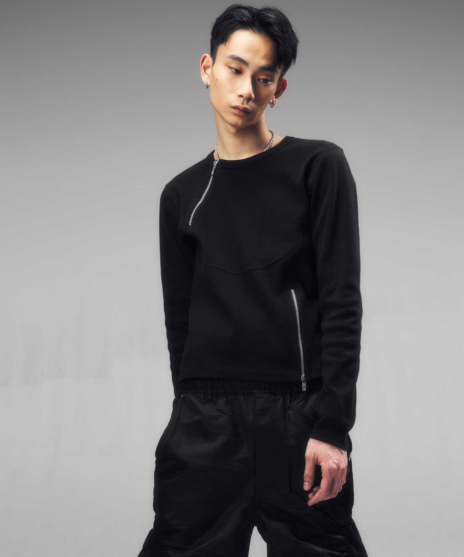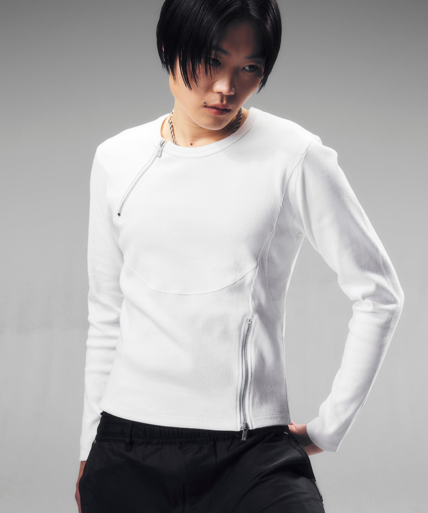 -デザイン-ベースはミニマルなロングスリーブTシャツですが、リブ素材によるフィット感を活かし、身体のラインを立体的に見せる設計になっています。フロントにはジップディテールを配置し、開閉によってネック周りの印象を調整できる構造です。ジップを閉じればシャープでミニマルな印象に、少し開けることで首元に抜け感が生まれ、インナーやアクセサリーとのレイヤードも際立ちます。