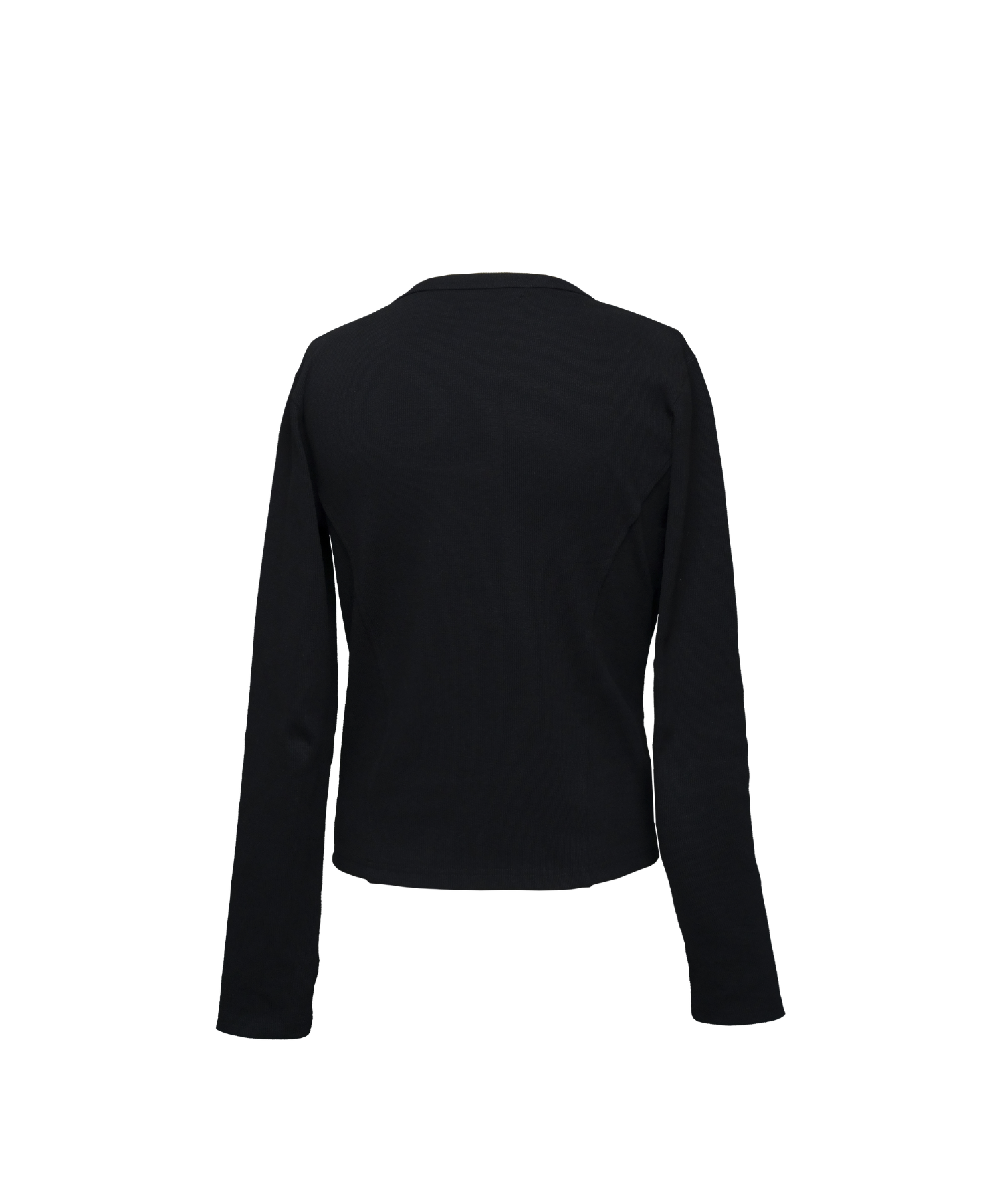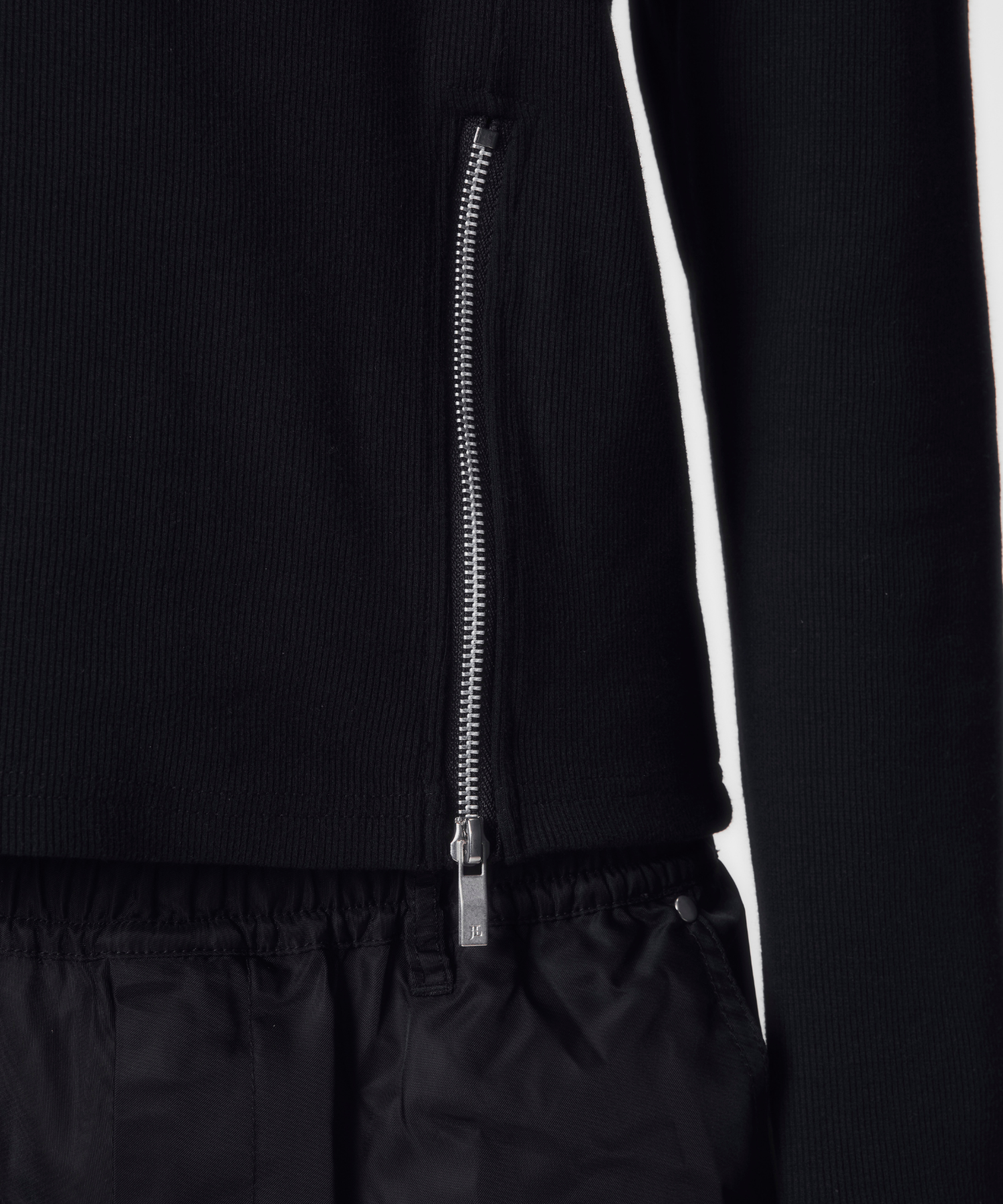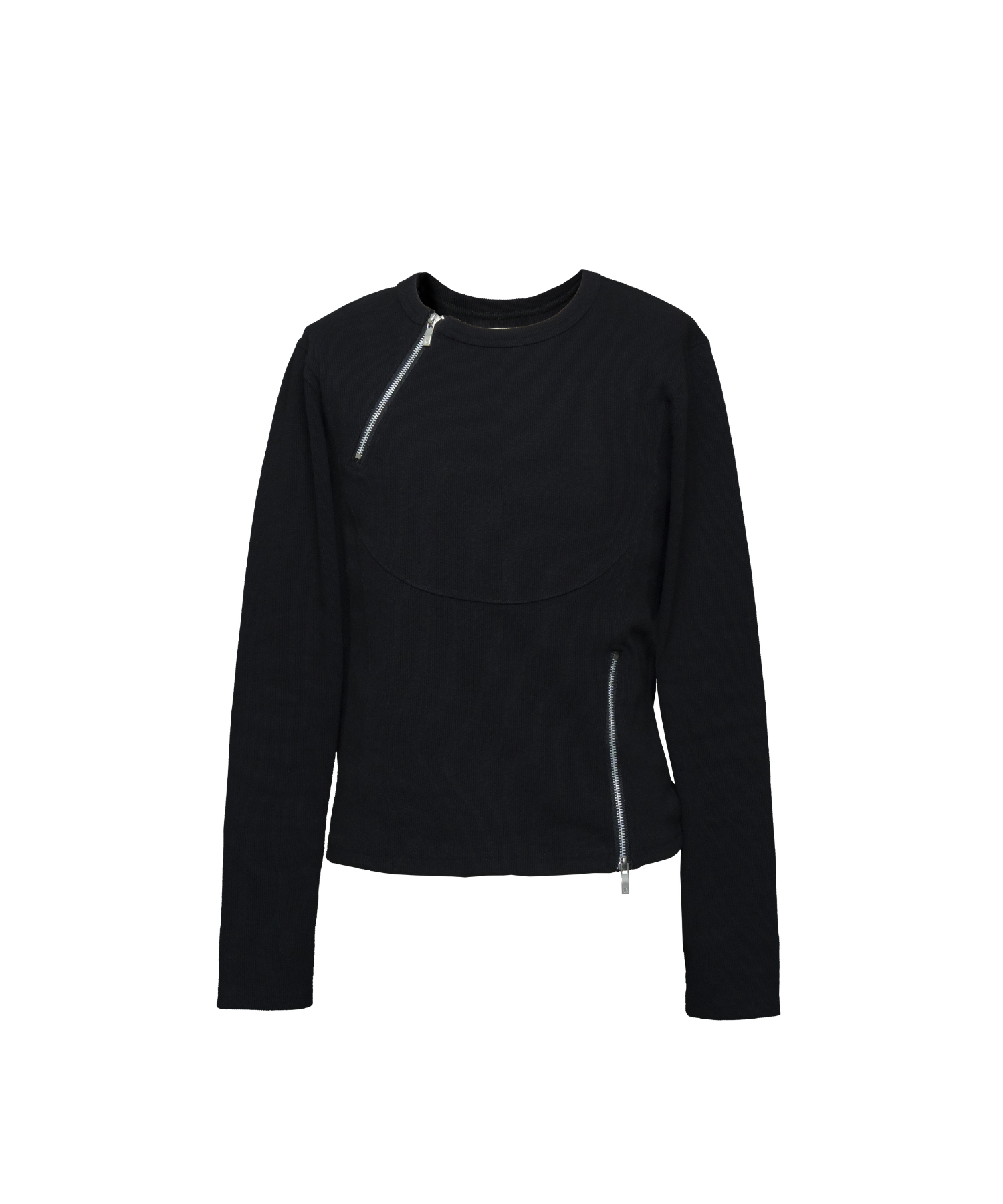 -デザイン-ベースはミニマルなロングスリーブTシャツですが、リブ素材によるフィット感を活かし、身体のラインを立体的に見せる設計になっています。フロントにはジップディテールを配置し、開閉によってネック周りの印象を調整できる構造です。ジップを閉じればシャープでミニマルな印象に、少し開けることで首元に抜け感が生まれ、インナーやアクセサリーとのレイヤードも際立ちます。