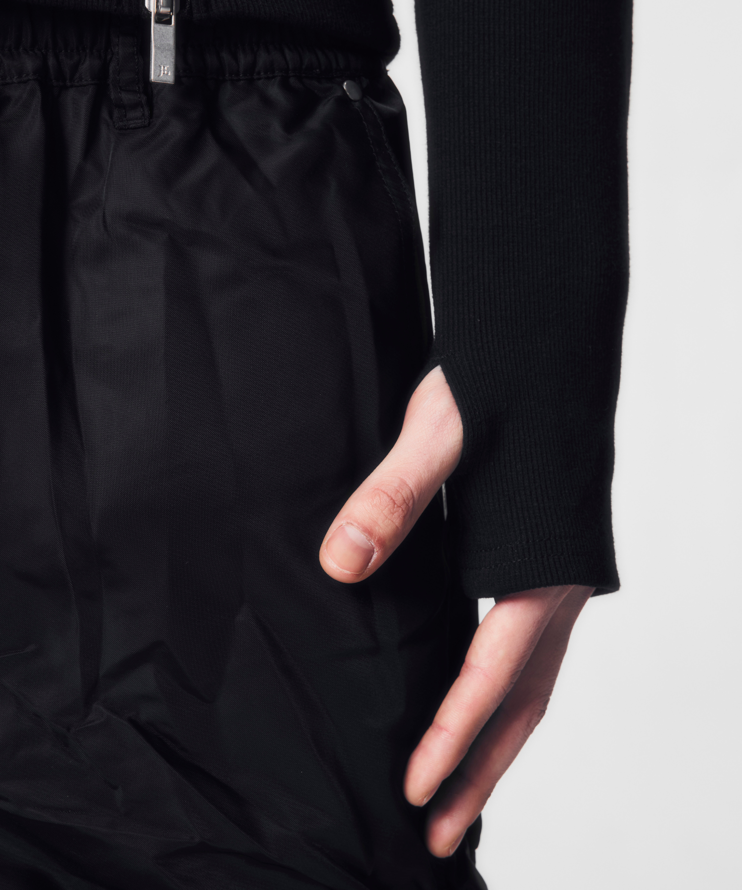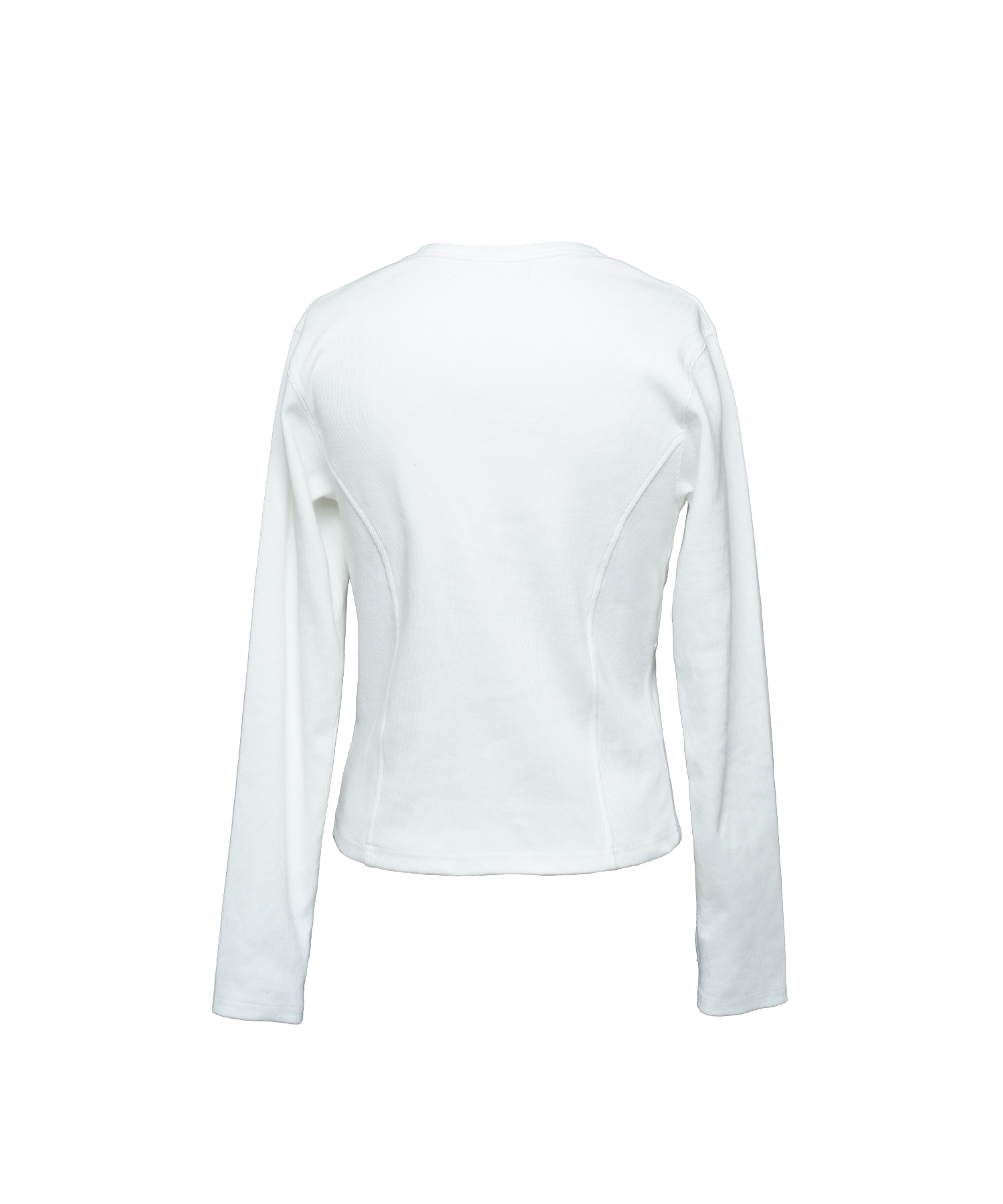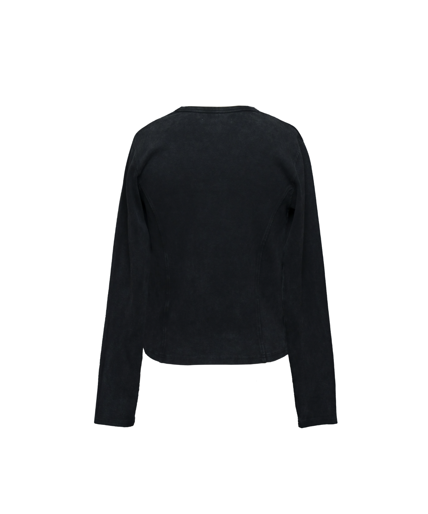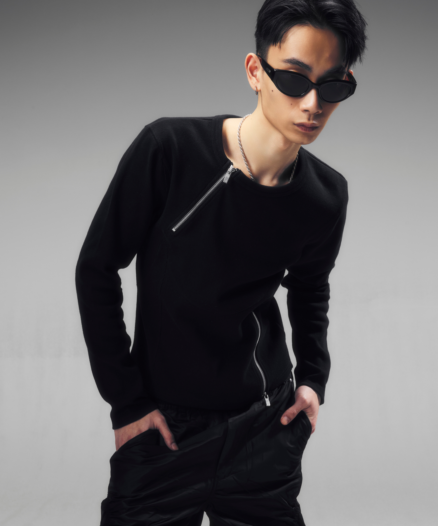 -デザイン-ベースはミニマルなロングスリーブTシャツですが、リブ素材によるフィット感を活かし、身体のラインを立体的に見せる設計になっています。フロントにはジップディテールを配置し、開閉によってネック周りの印象を調整できる構造です。ジップを閉じればシャープでミニマルな印象に、少し開けることで首元に抜け感が生まれ、インナーやアクセサリーとのレイヤードも際立ちます。