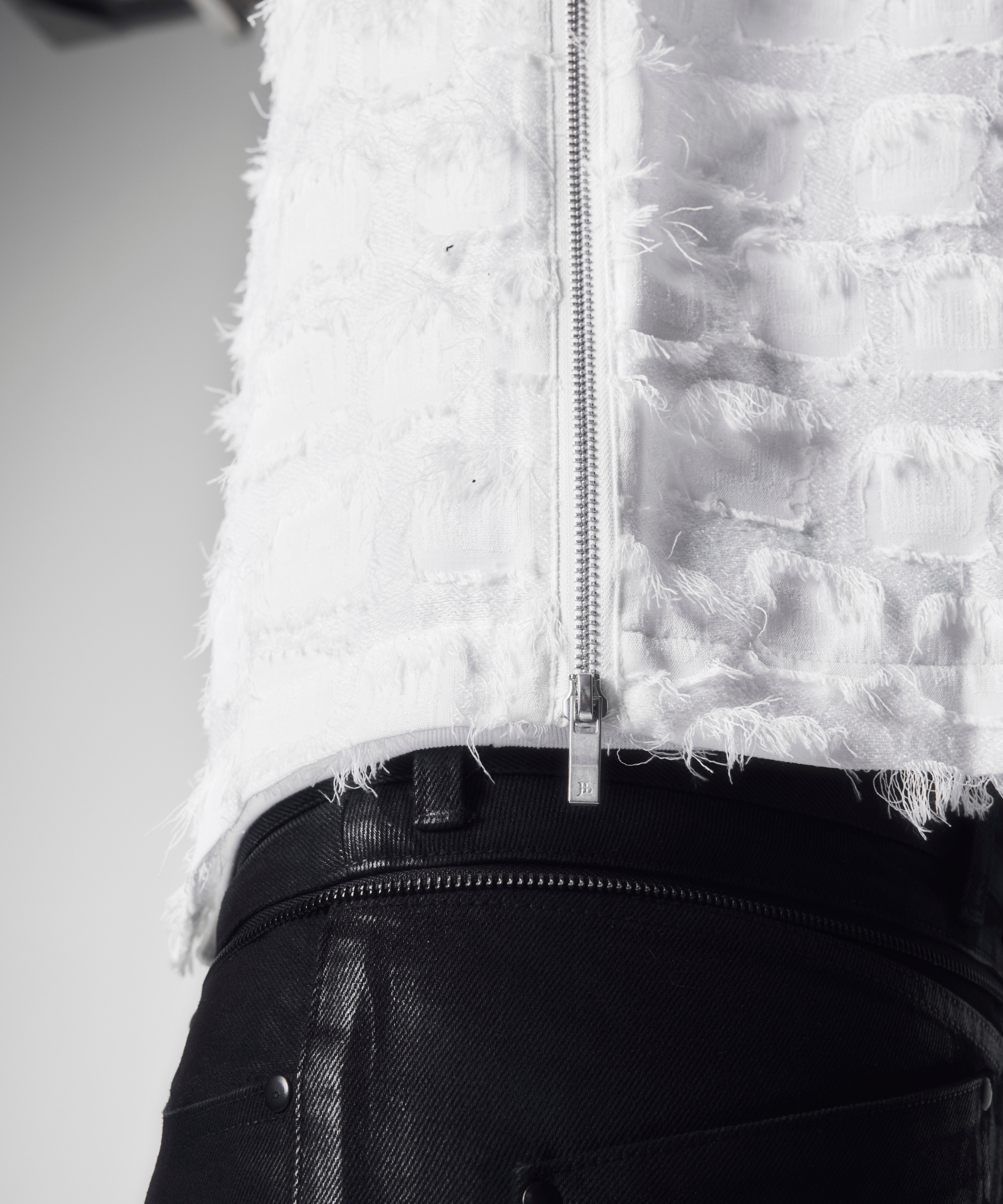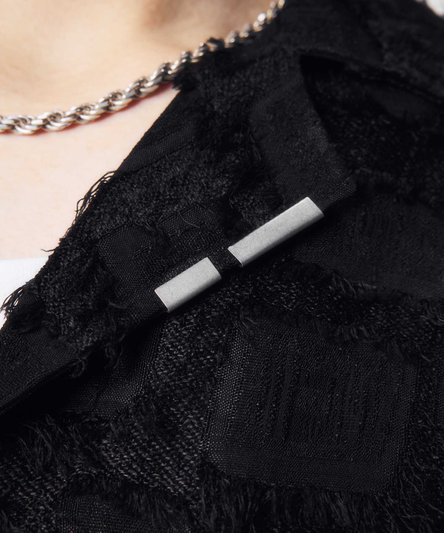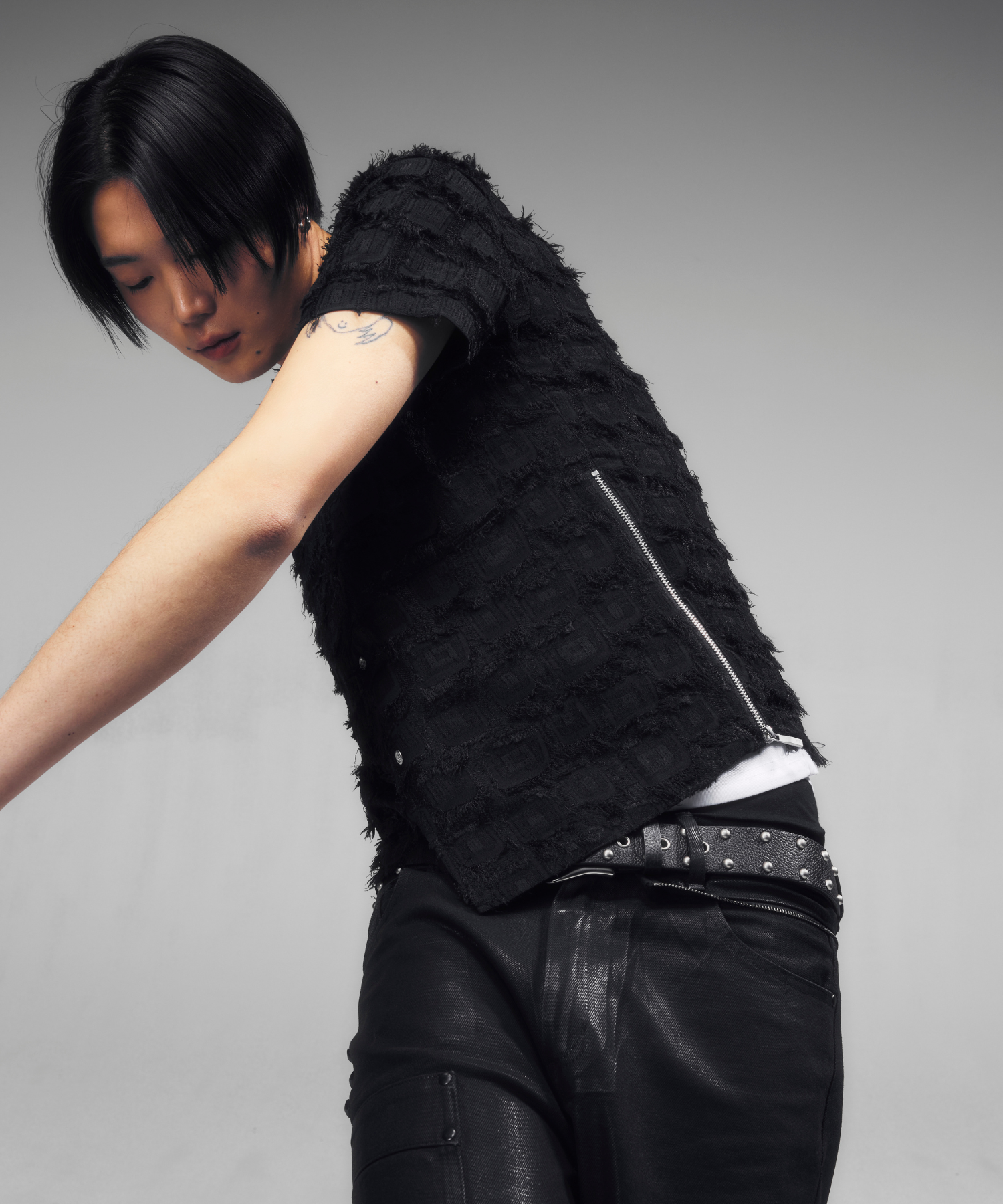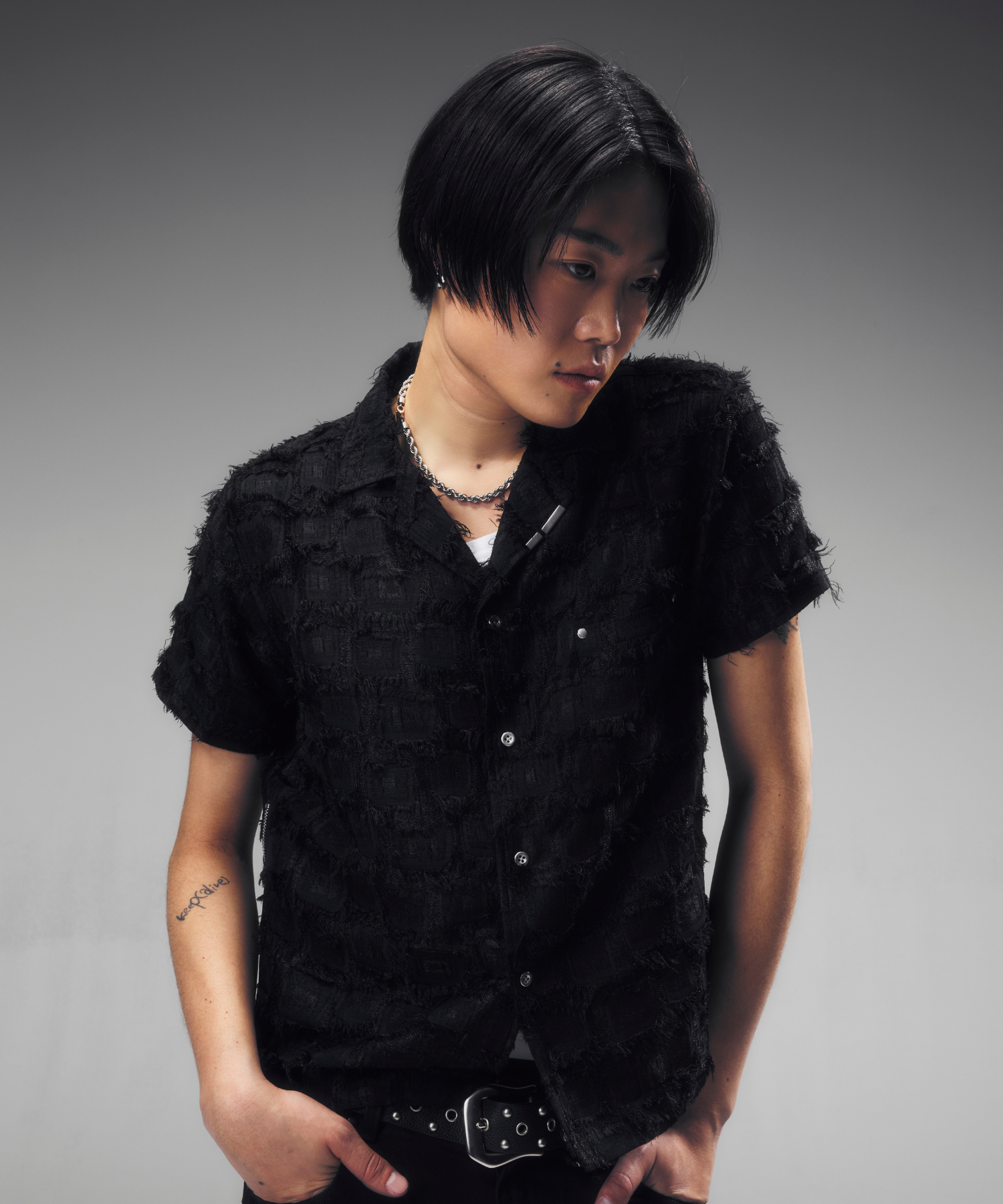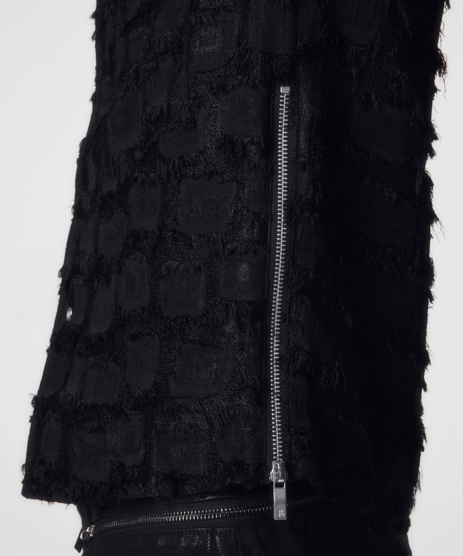 -デザイン-サイドに配置されたジップとフリンジディテールが特徴のシャツ。ベースはミニマルなシャツ構造でありながら、サイドジップを開閉することでシルエットやレイヤーの見え方を調整できる設計になっています。フリンジは動きに合わせて揺れ、静的なシャツに動的な表情を加えます。ジップを閉じればシャープなラインのトップスとして、開けばインナーとのレイヤードが強調され、スタイリングに奥行きが生まれます。