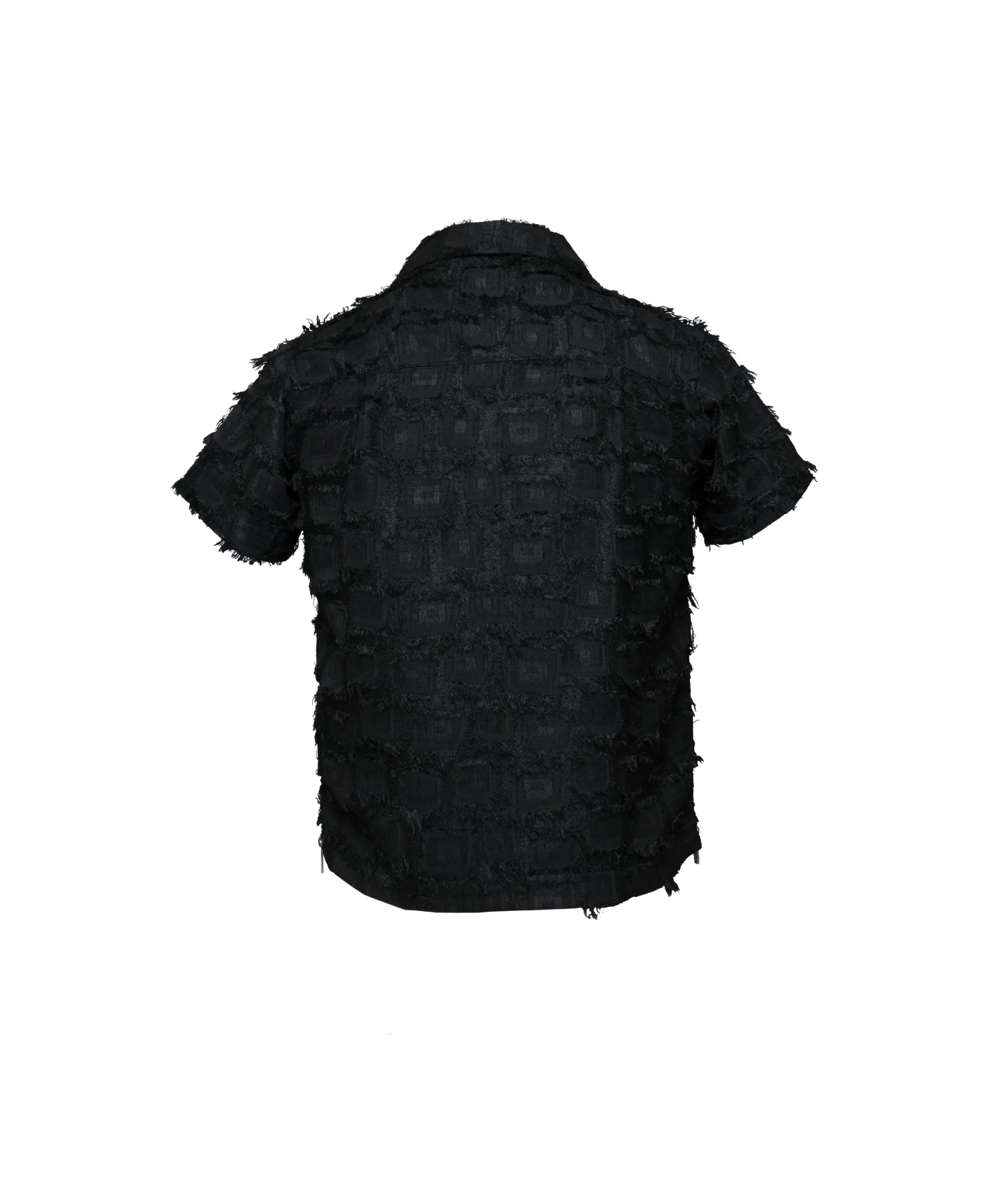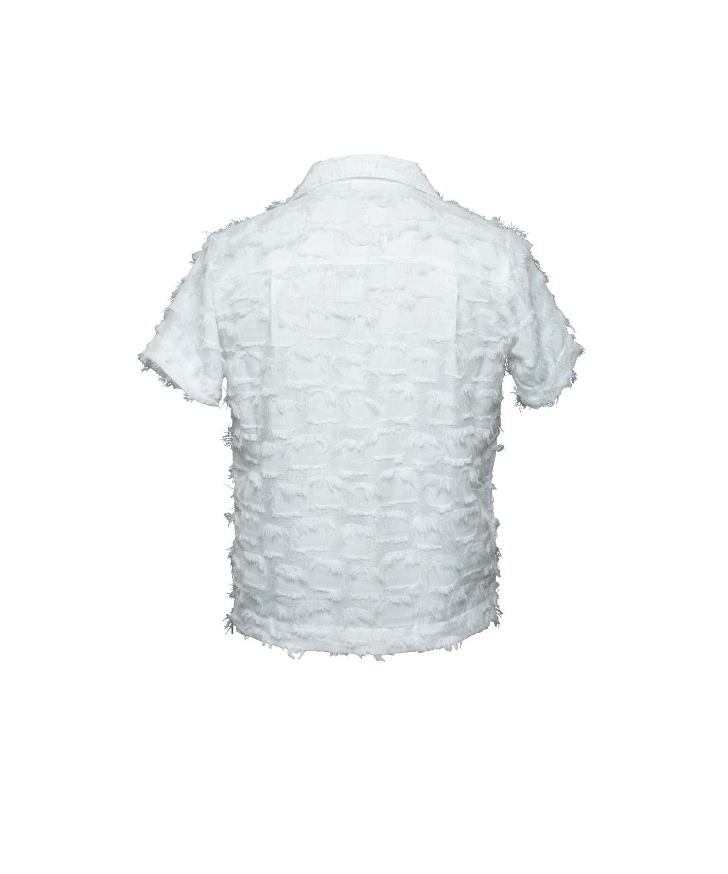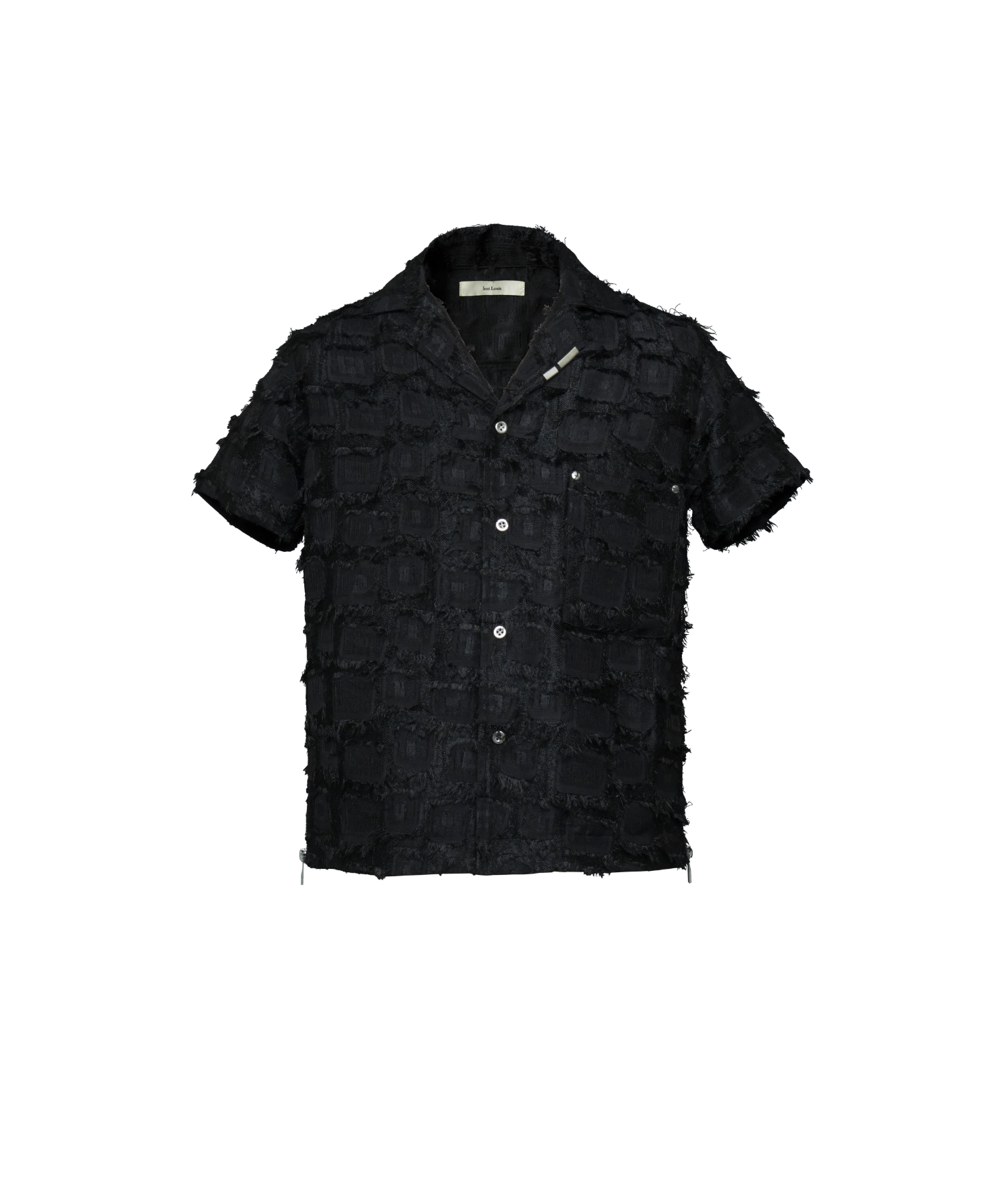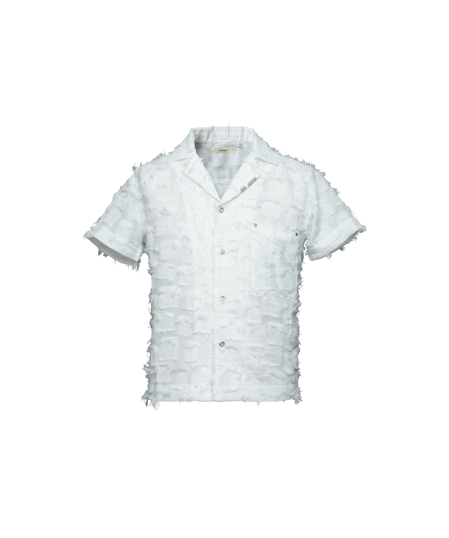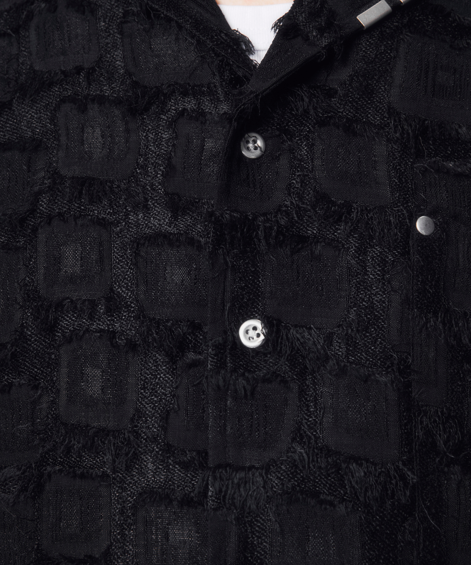 -デザイン-サイドに配置されたジップとフリンジディテールが特徴のシャツ。ベースはミニマルなシャツ構造でありながら、サイドジップを開閉することでシルエットやレイヤーの見え方を調整できる設計になっています。フリンジは動きに合わせて揺れ、静的なシャツに動的な表情を加えます。ジップを閉じればシャープなラインのトップスとして、開けばインナーとのレイヤードが強調され、スタイリングに奥行きが生まれます。