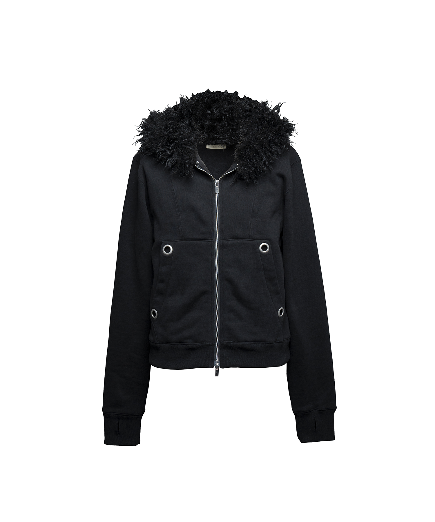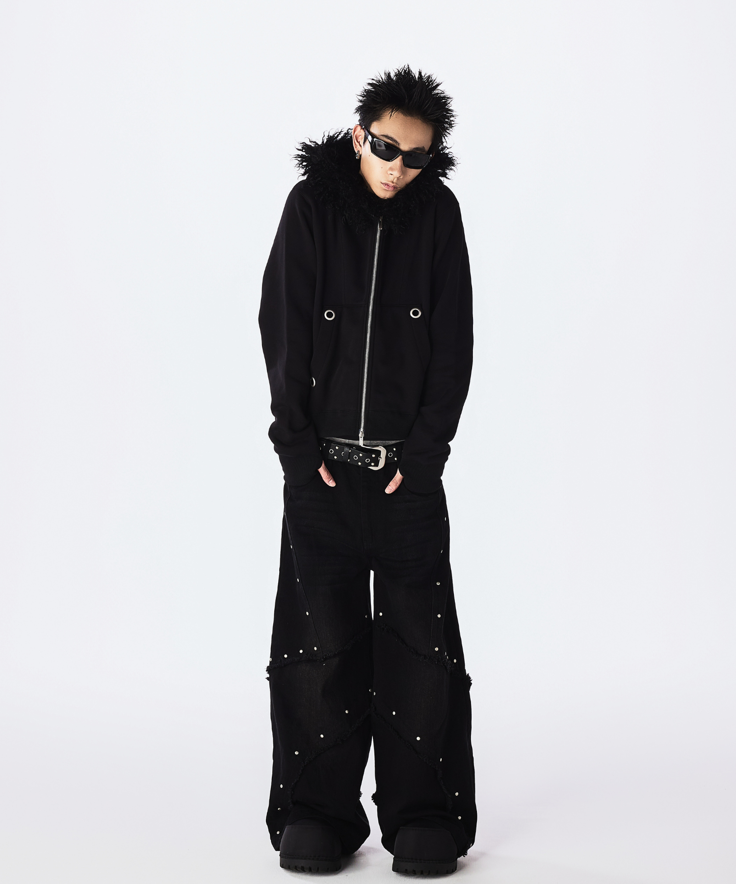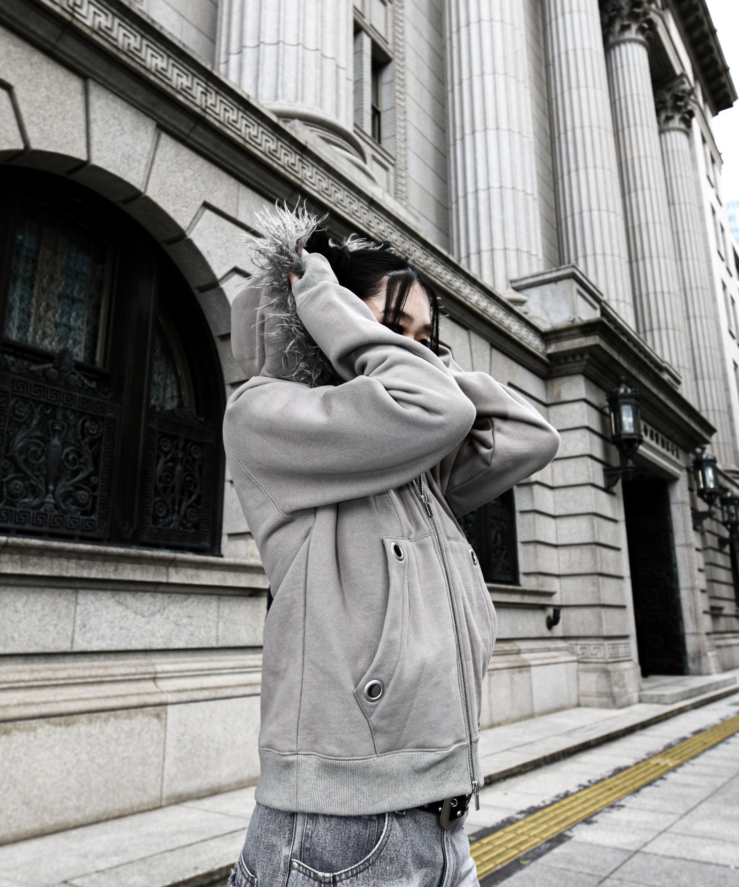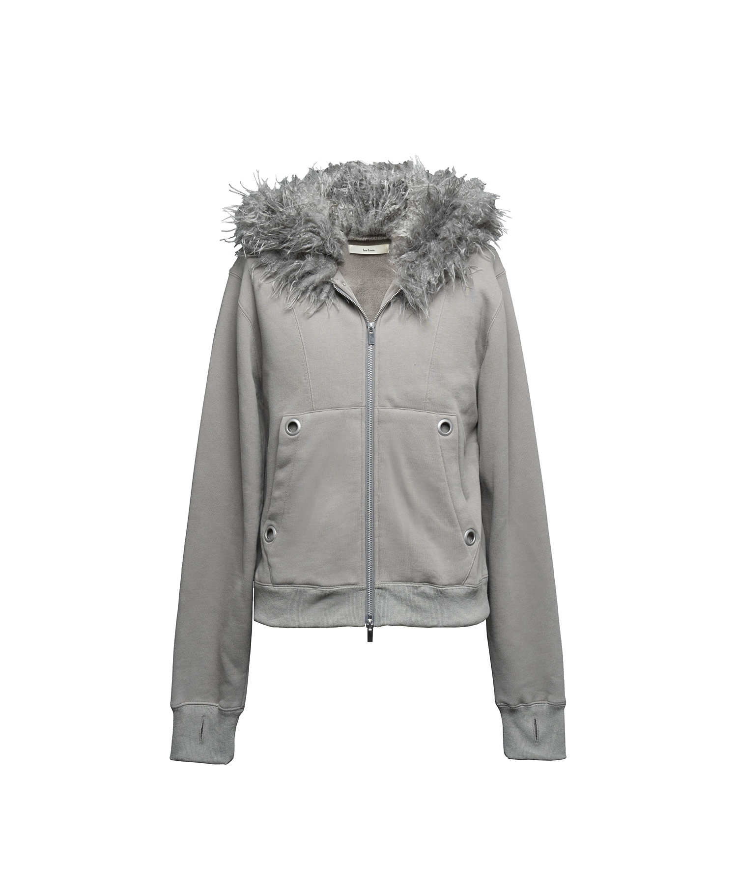 ファーフードのボリュームと構築的なフォルムが生み出すコントラストで、モードかつ存在感のある佇まいに仕上げています。
