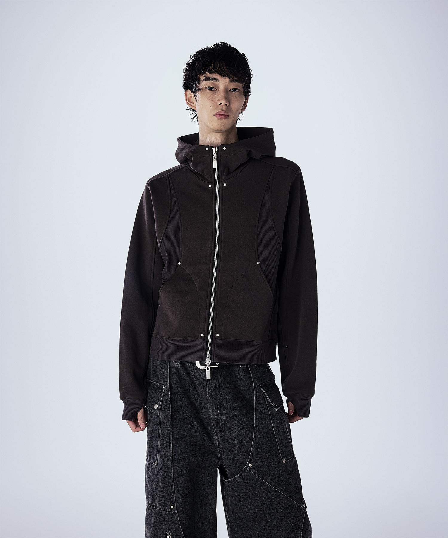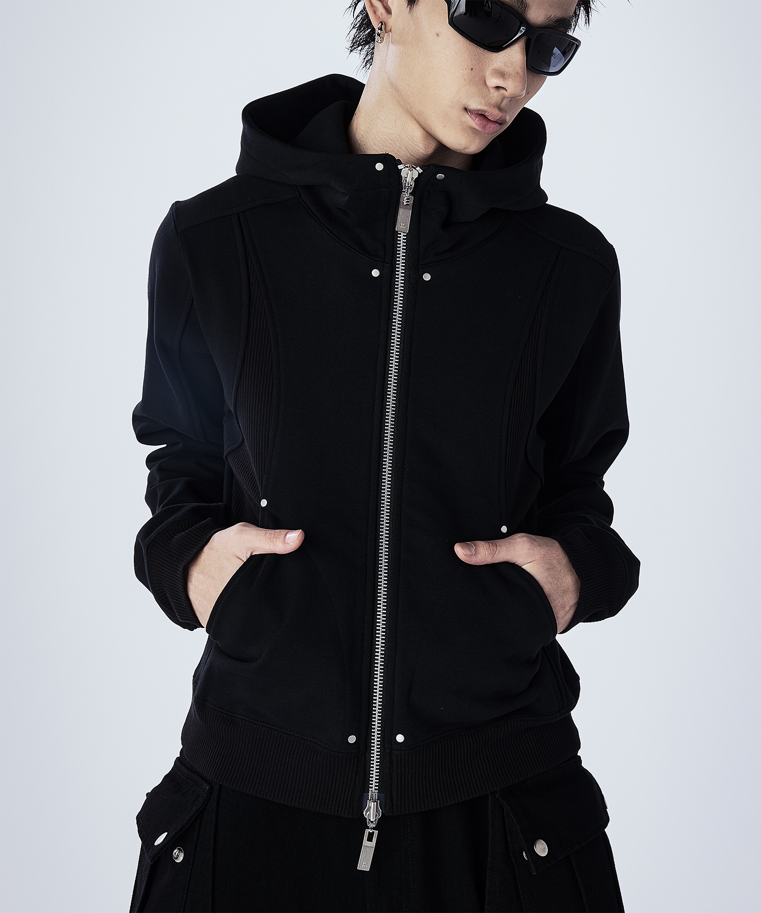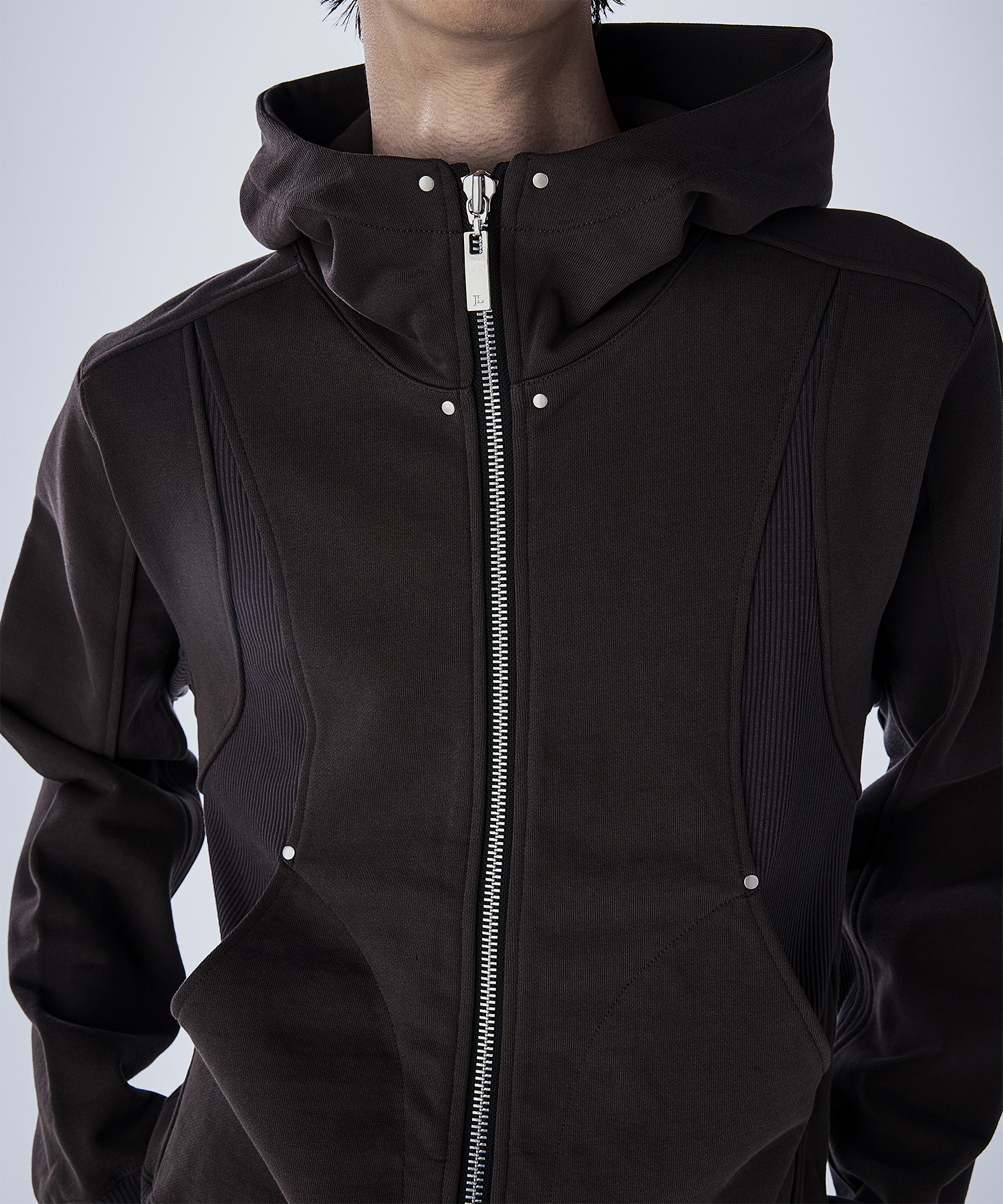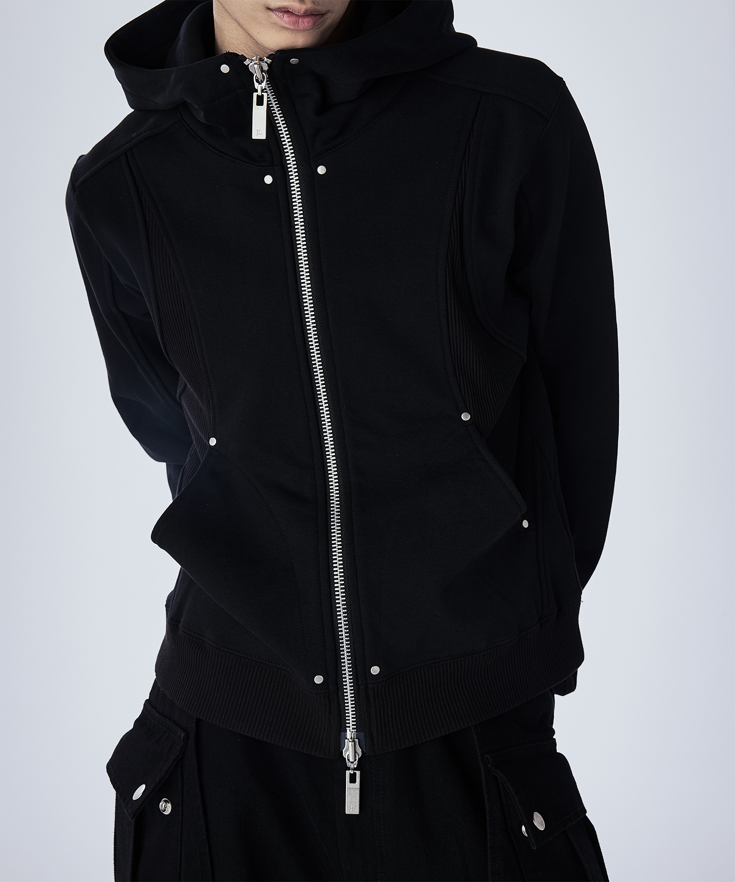 首元が高めのダブルジップ仕様で、シルエットをすっきり見せつつモードな印象に。 JLオリジナルの大ぶりなスライダーがさりげないアクセントとなり、フードは大きめでダブル仕様になっており、立体感のあるデザインとなっております。 一枚で主役になるデザインなので、シンプルなボトムスと合わせるだけでコーデが決まるアイテムで