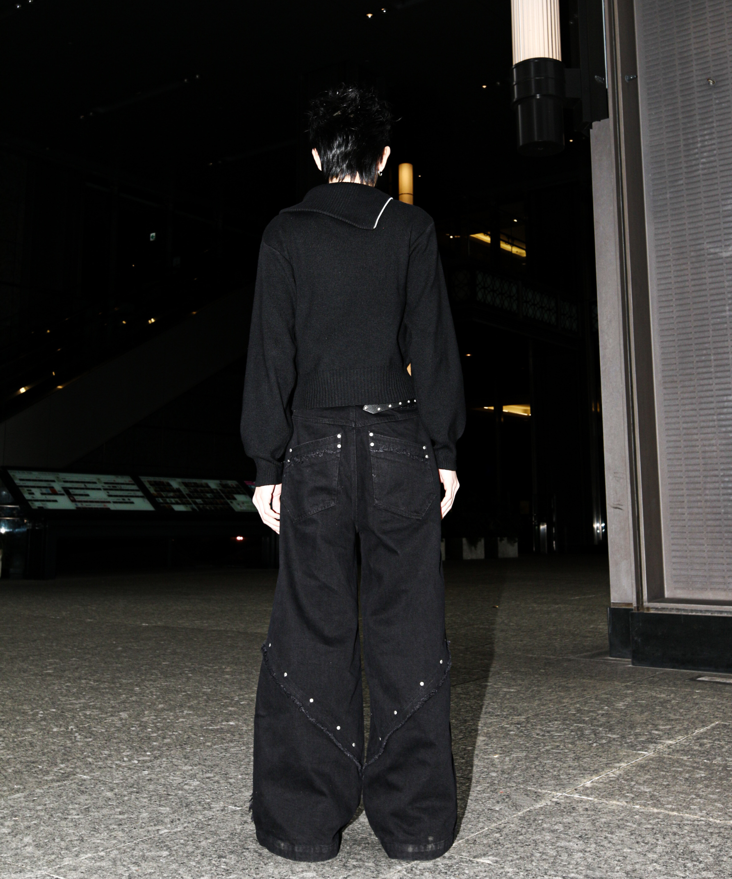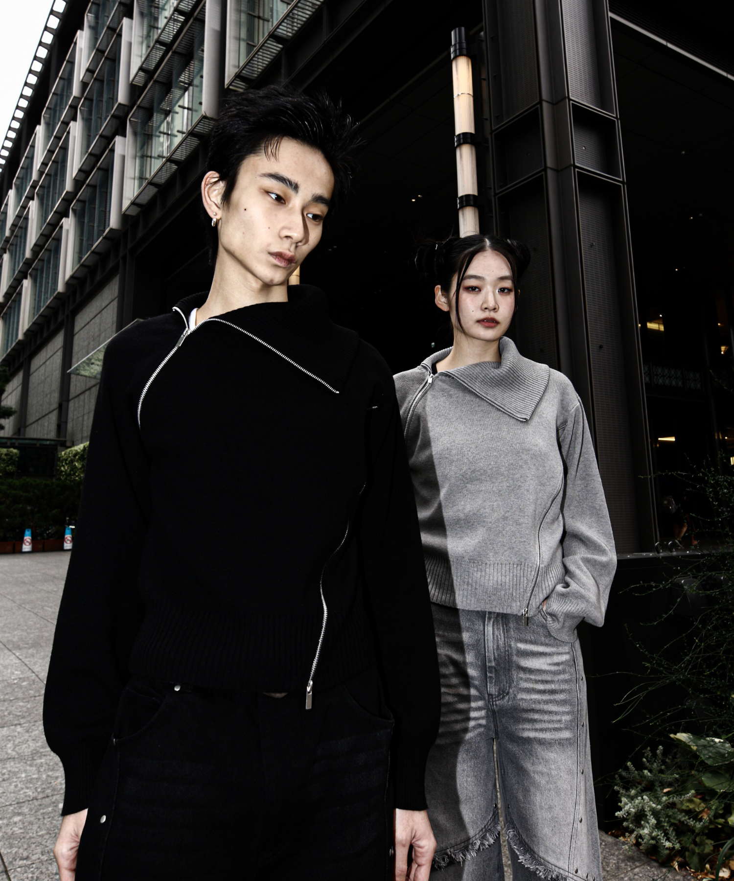 特徴的なアシンメトリージップと、セーラーカラーを思わせるハイネックデザインが印象的な一着。ジップの開閉によって襟の形を自在に変えられ、モードからカジュアルまで幅広い表情を演出します。