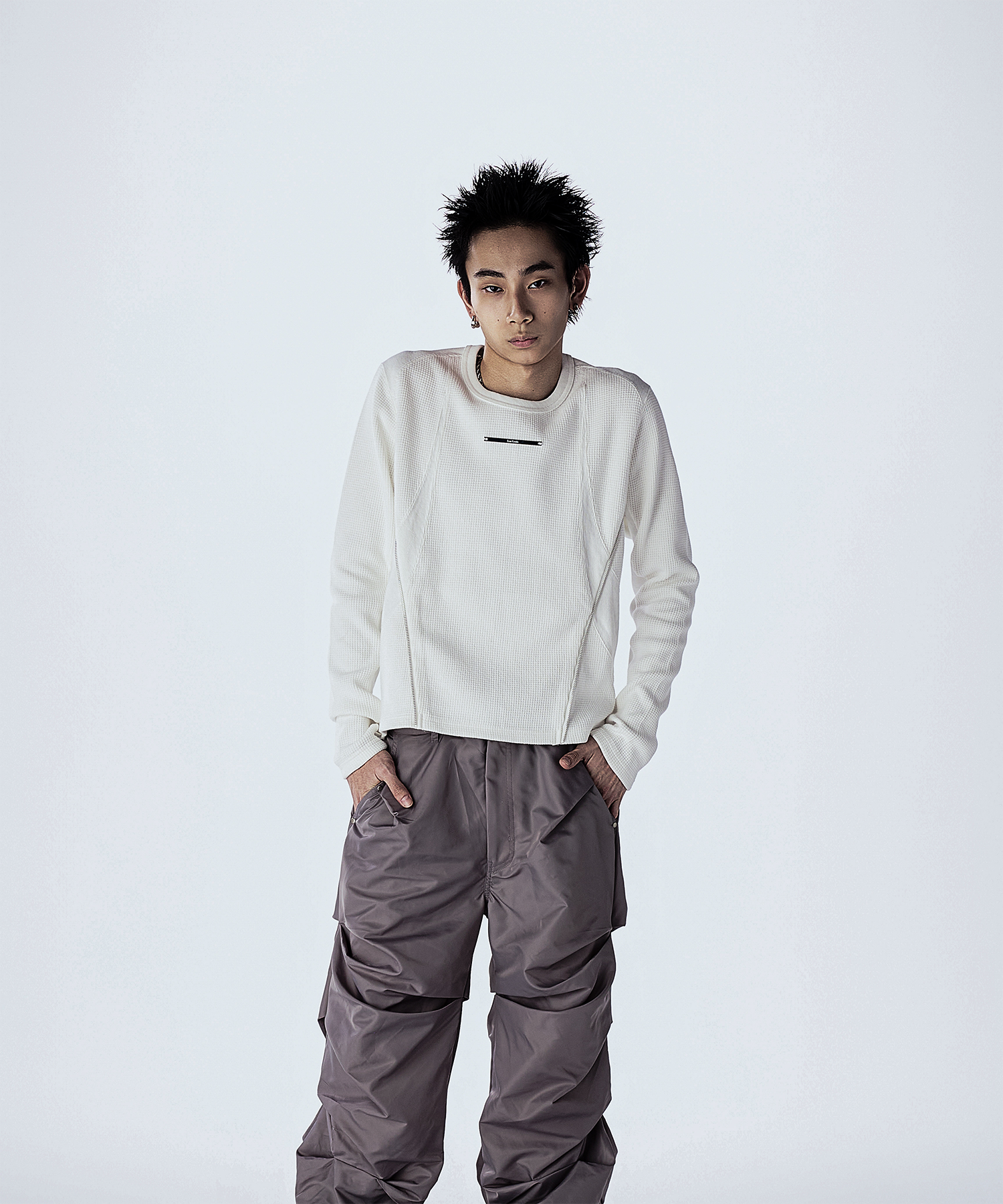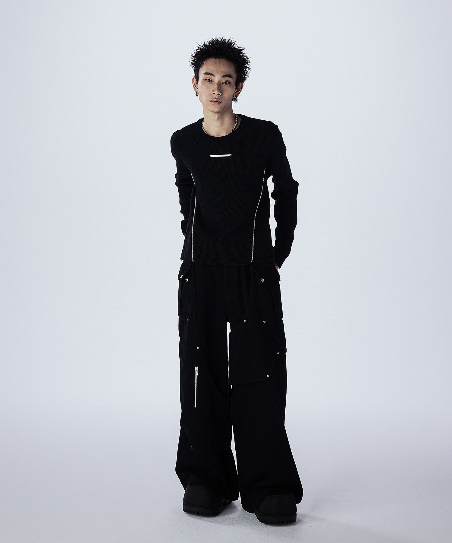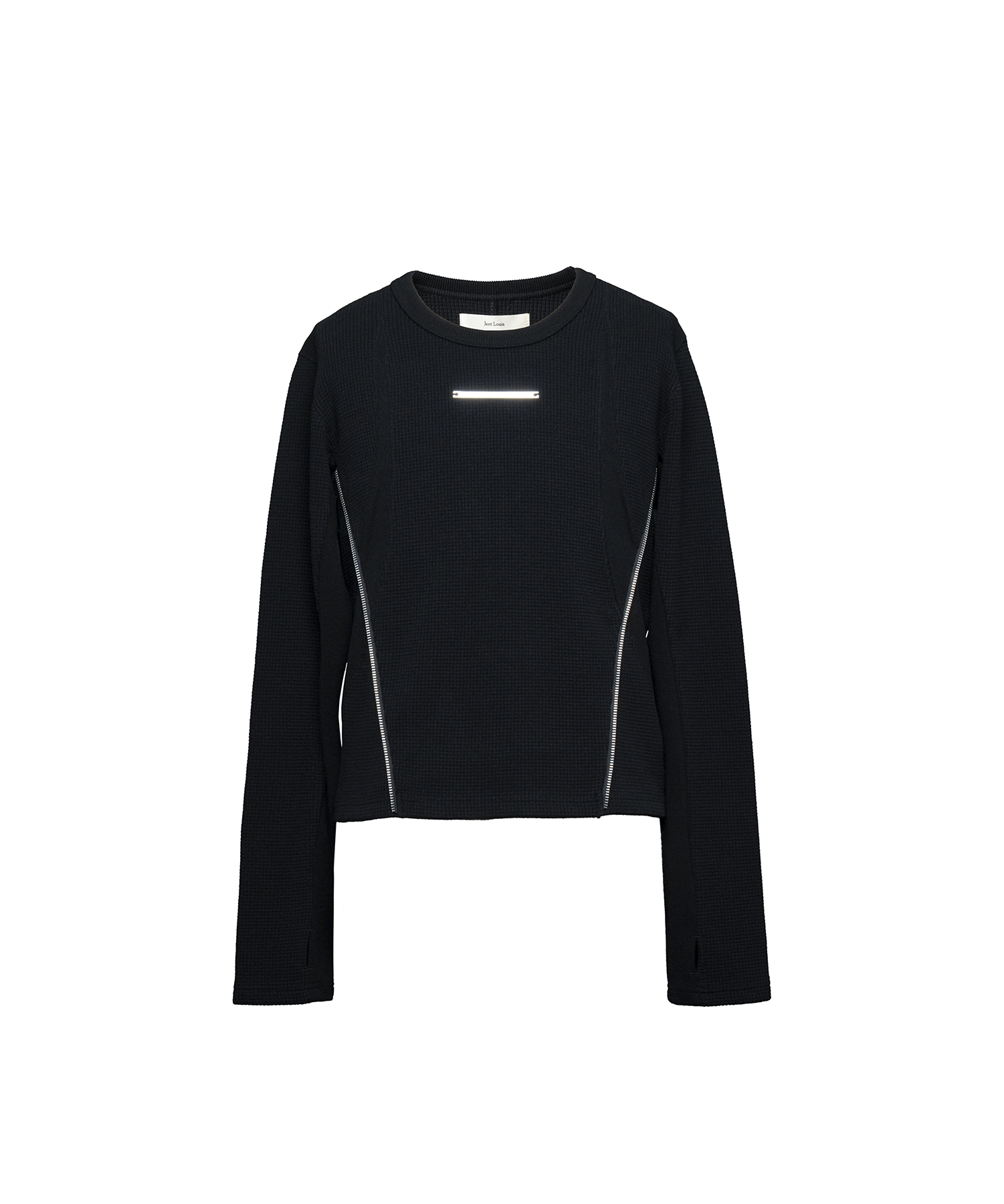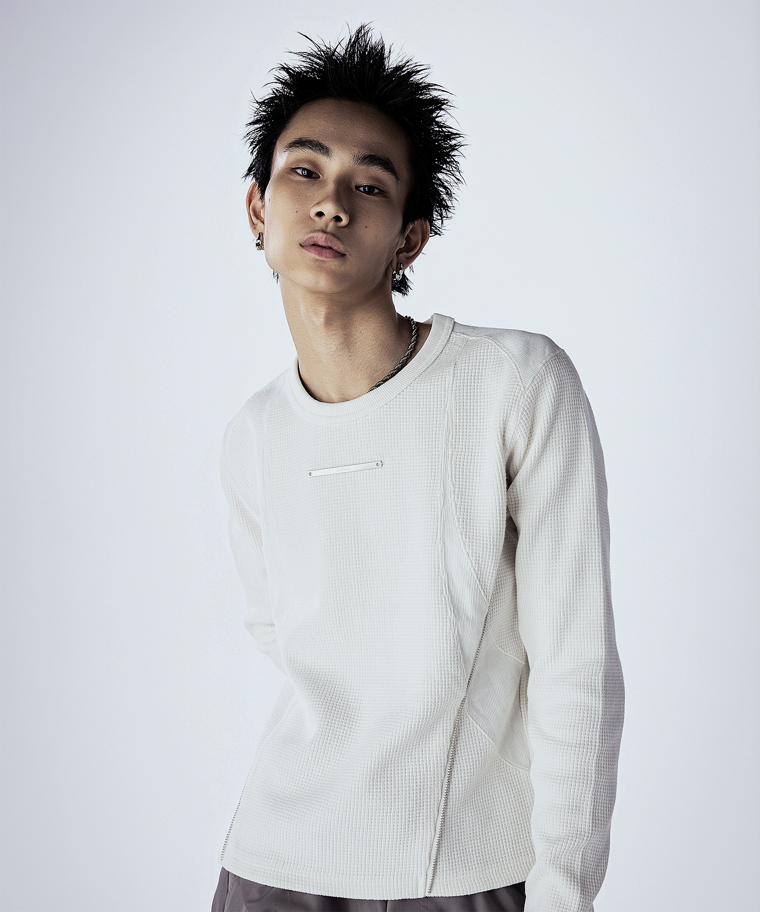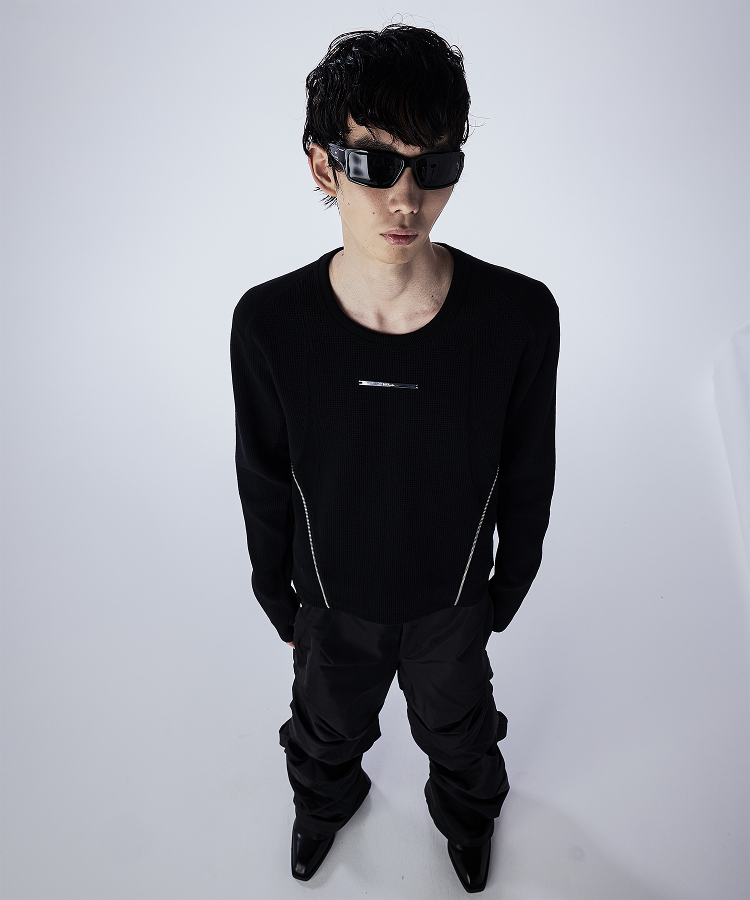 首元が広く、身幅はタイトなシルエットで、インナーとしても一枚着としても活躍するデザインです。袖口にはフィンガーホールを備え、機能性とスタイルを両立。さらに、両脇切り替えラインにはジップの片畝をドッキングさせた独自のデザインが特徴です。
