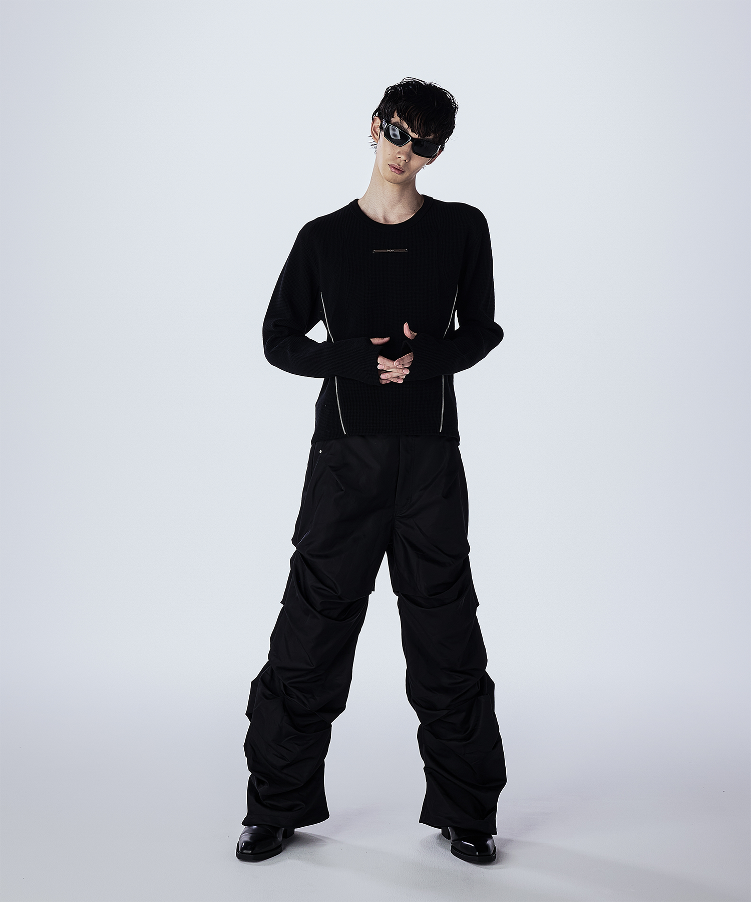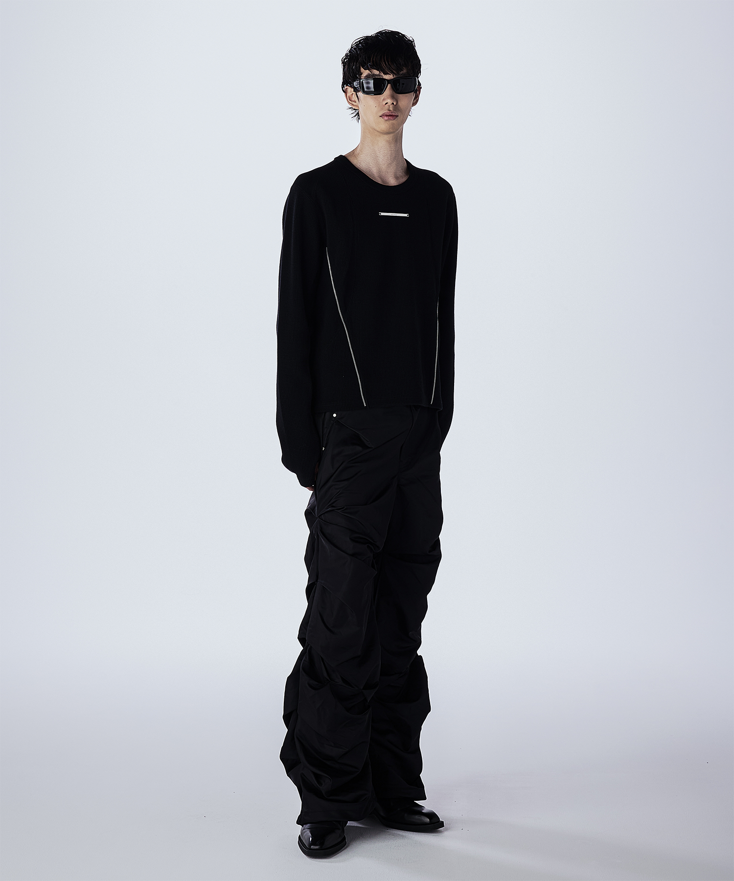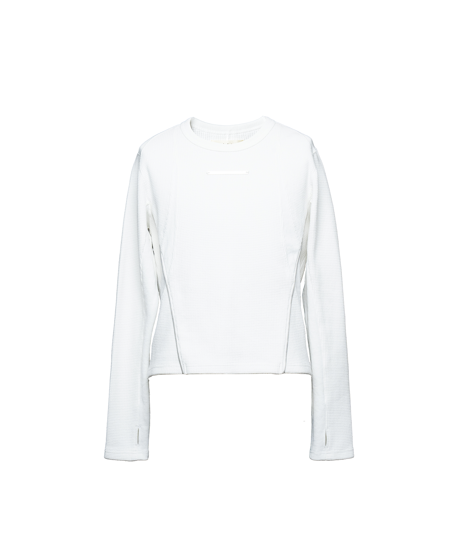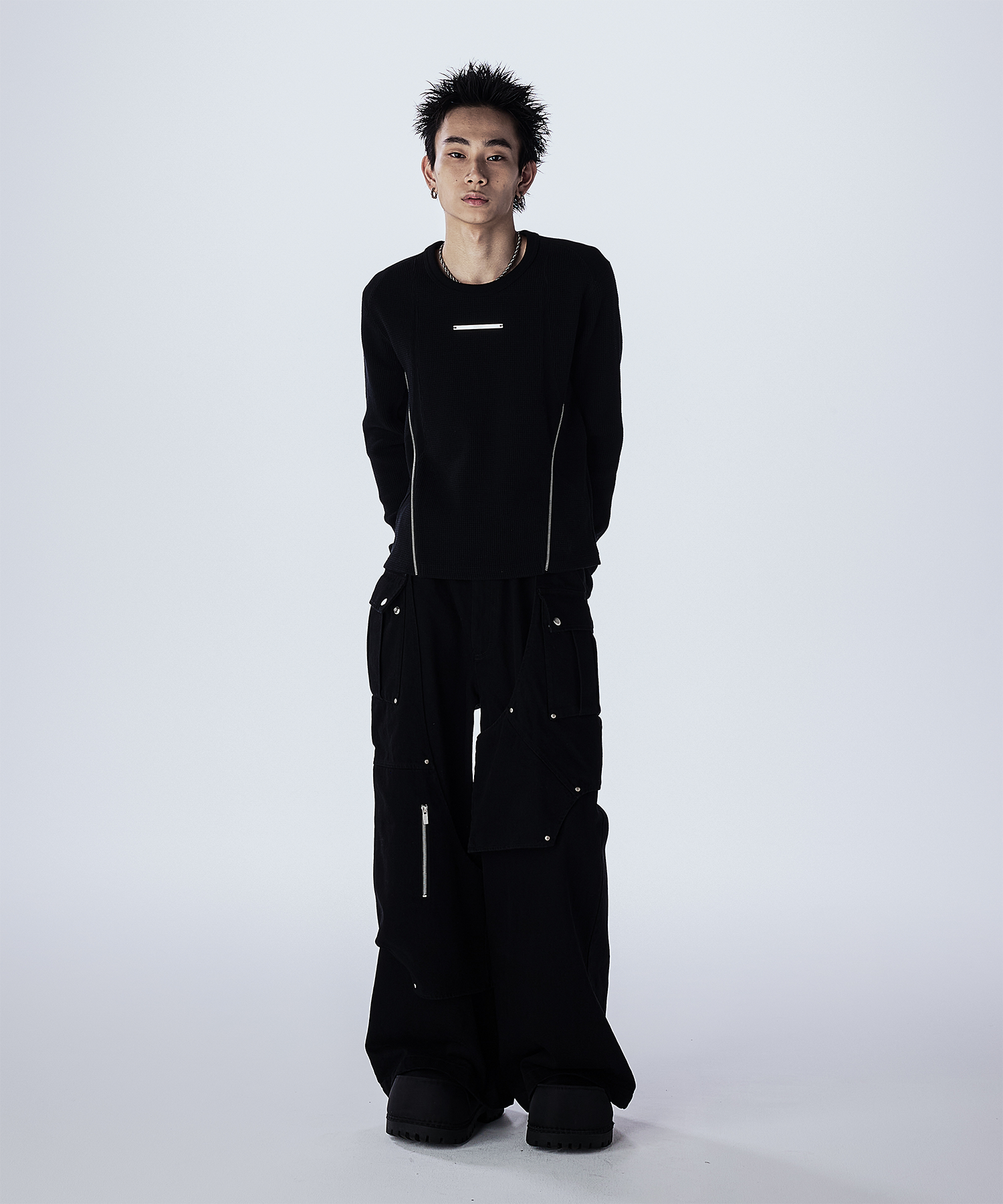 首元が広く、身幅はタイトなシルエットで、インナーとしても一枚着としても活躍するデザインです。袖口にはフィンガーホールを備え、機能性とスタイルを両立。さらに、両脇切り替えラインにはジップの片畝をドッキングさせた独自のデザインが特徴です。
