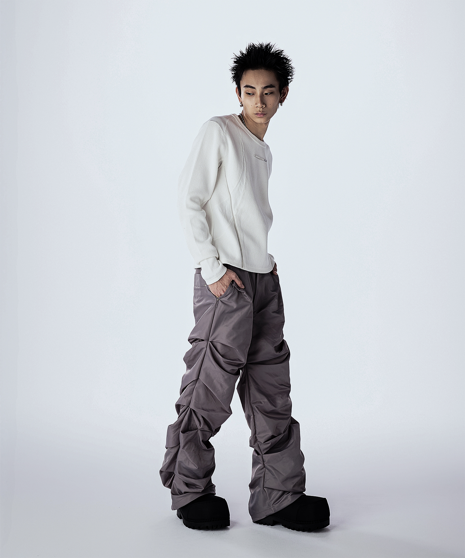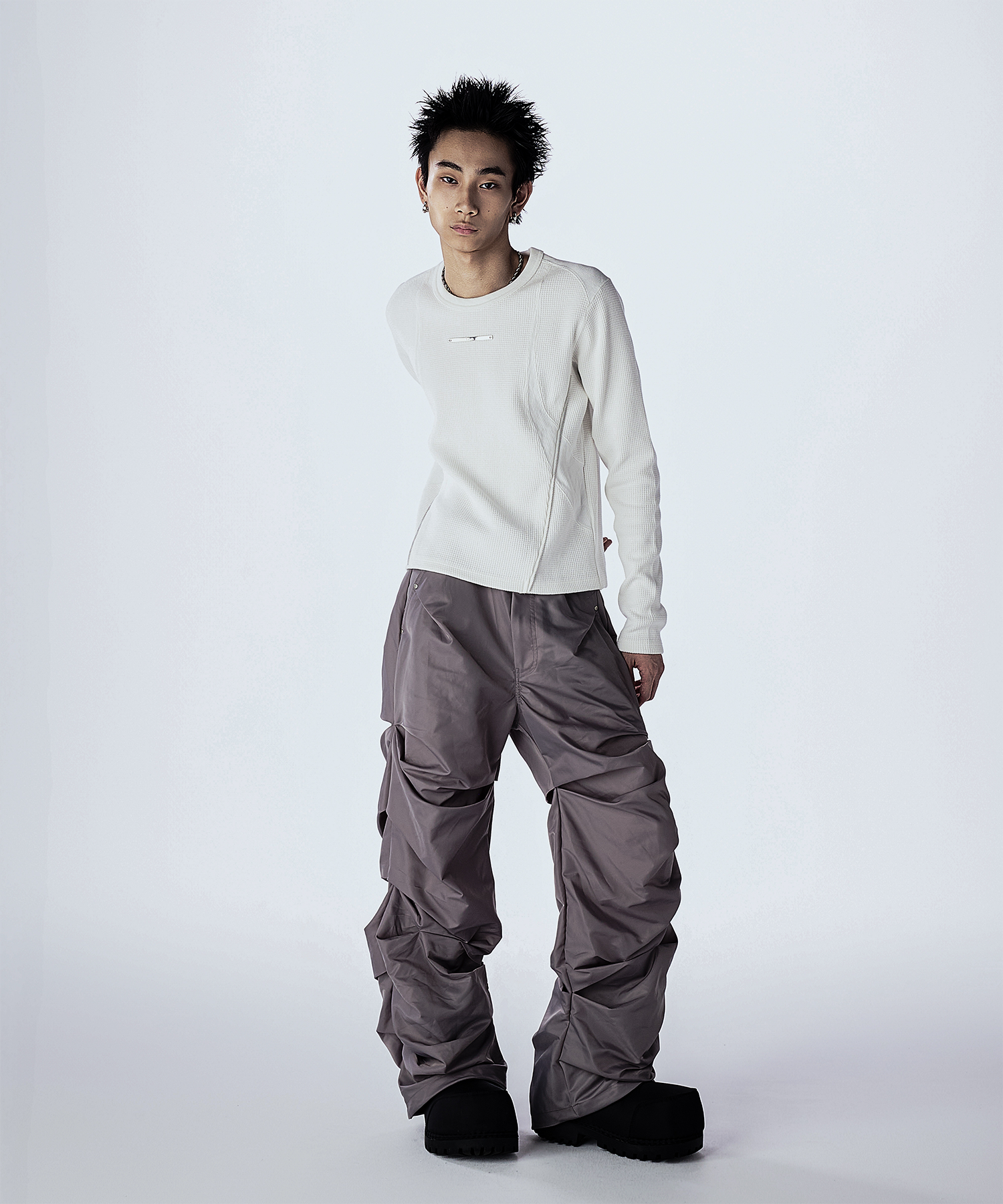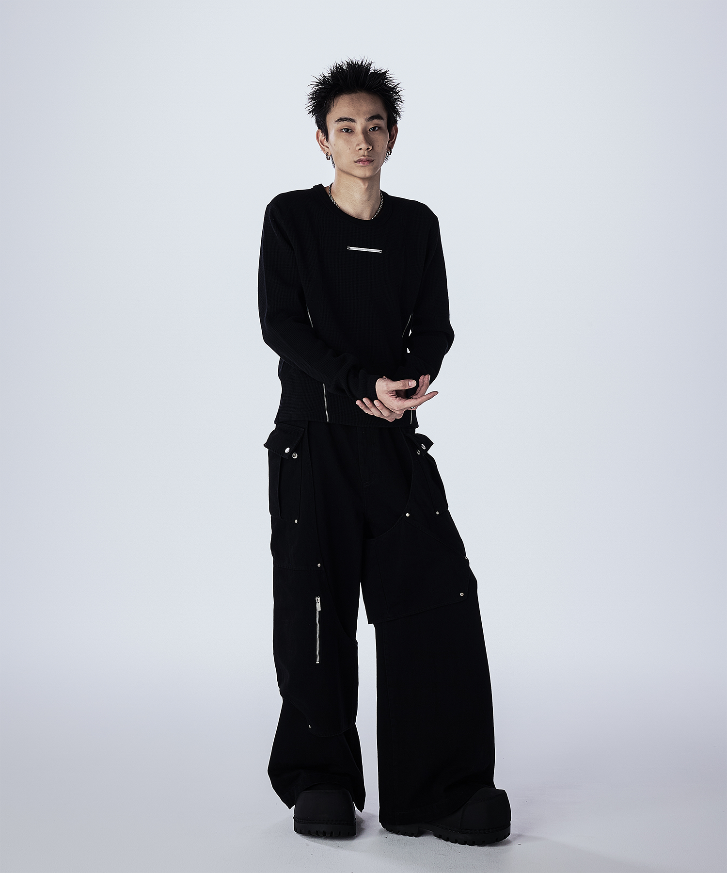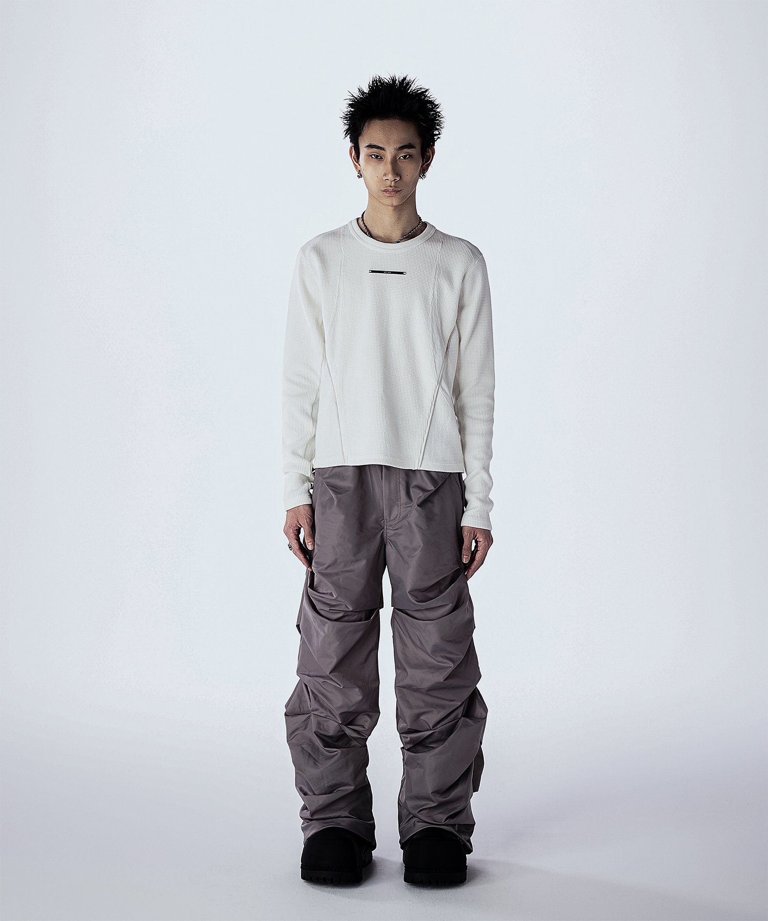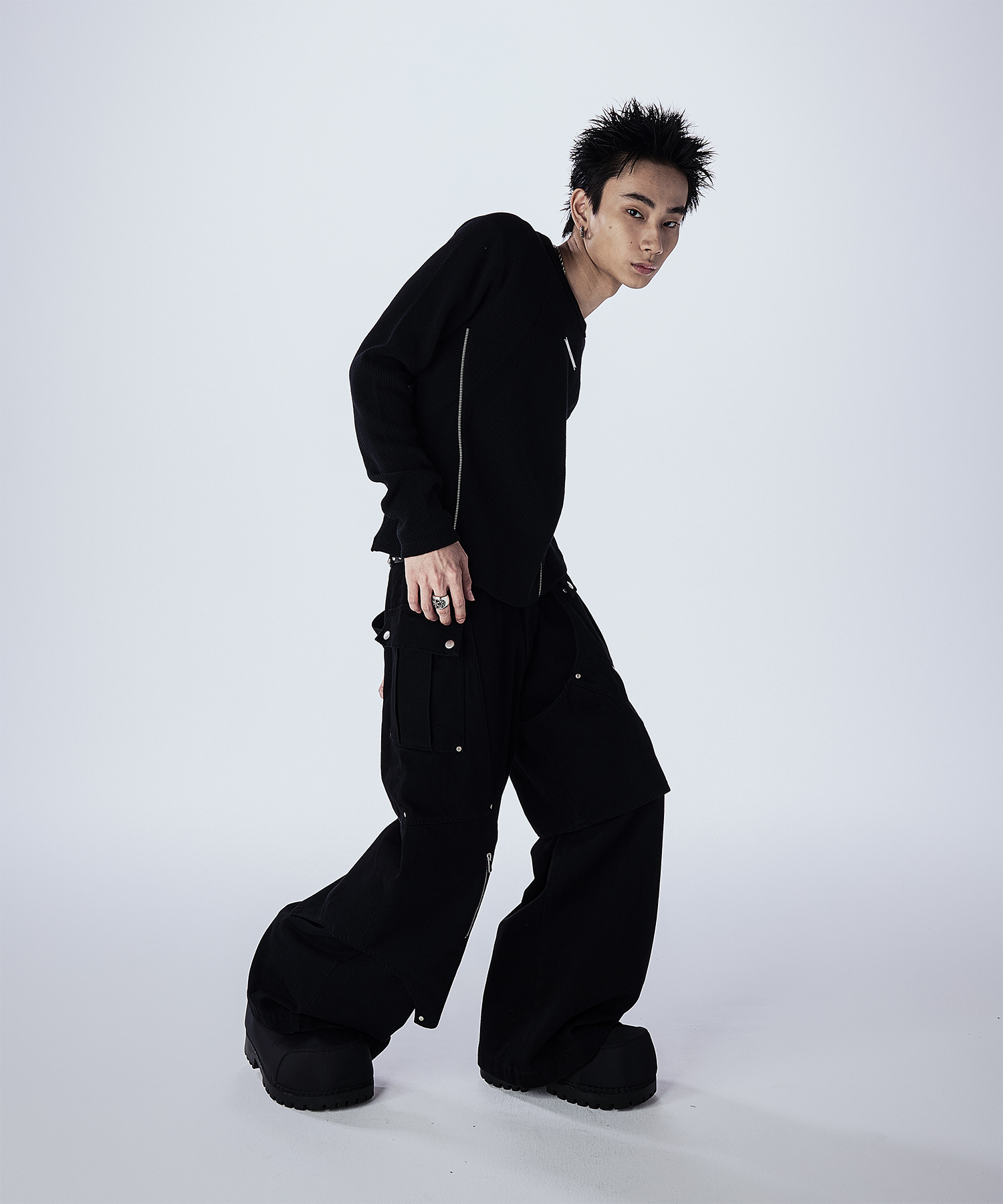 首元が広く、身幅はタイトなシルエットで、インナーとしても一枚着としても活躍するデザインです。袖口にはフィンガーホールを備え、機能性とスタイルを両立。さらに、両脇切り替えラインにはジップの片畝をドッキングさせた独自のデザインが特徴です。
